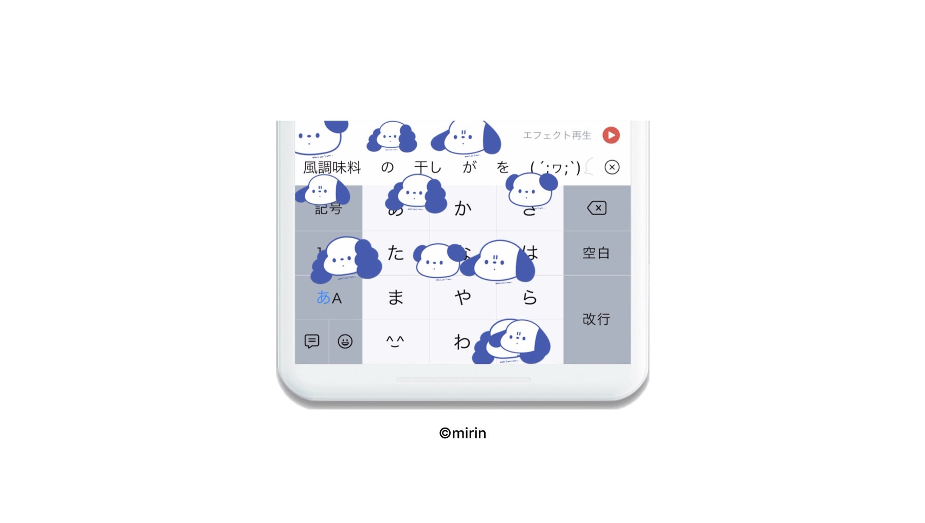 ユーザーが文字を入力し、変換候補より特定のキーワードを選択することで画像がキーボード上に現れる機能です。今回のコラボでは特定のキーワード「みりん」「もぷちゃぷ」「もっぷ」「ちゃちゃ」「ぷん」入力するとエフェクトが再生されます。今回のコラボならではのエフェクトをお楽しみください。