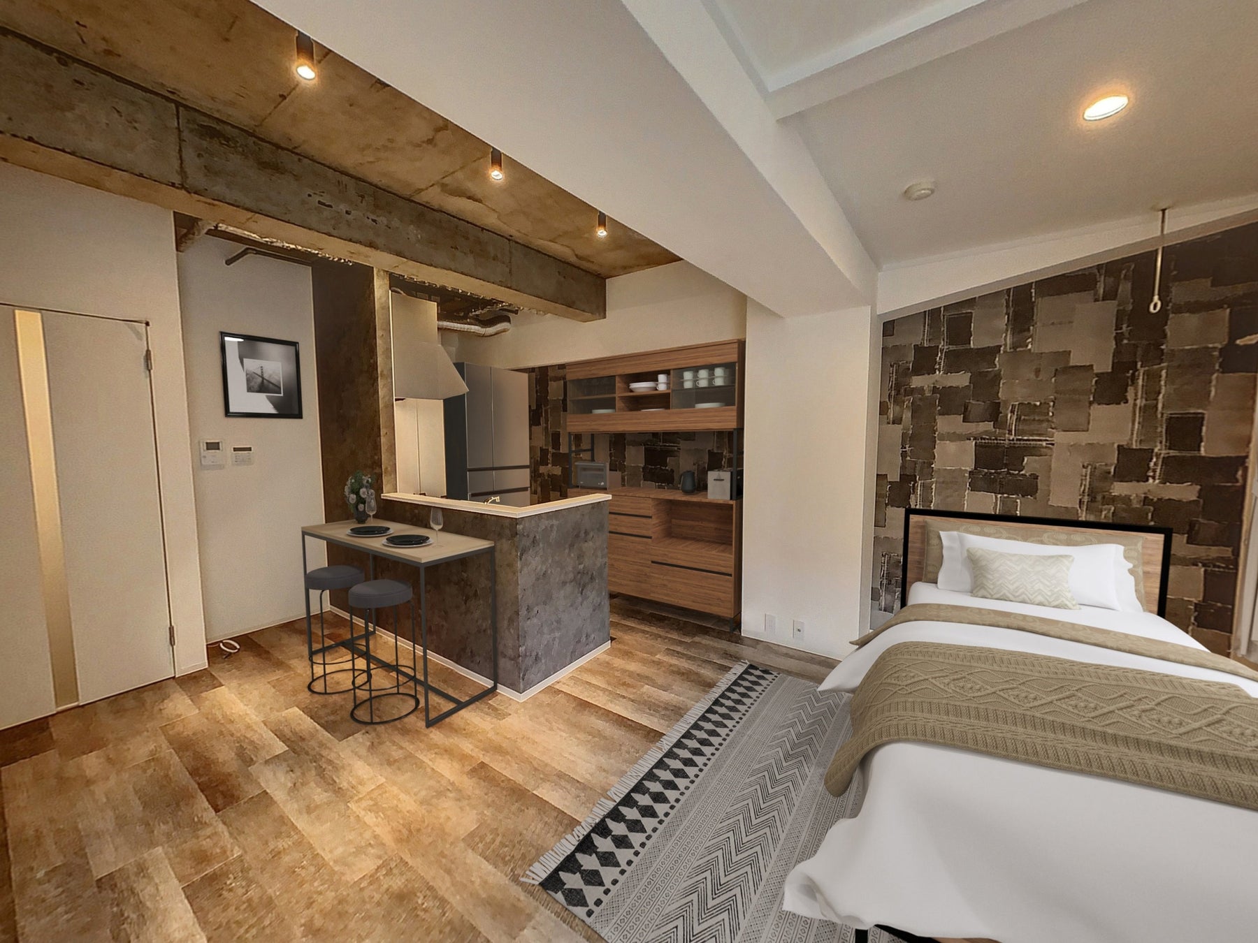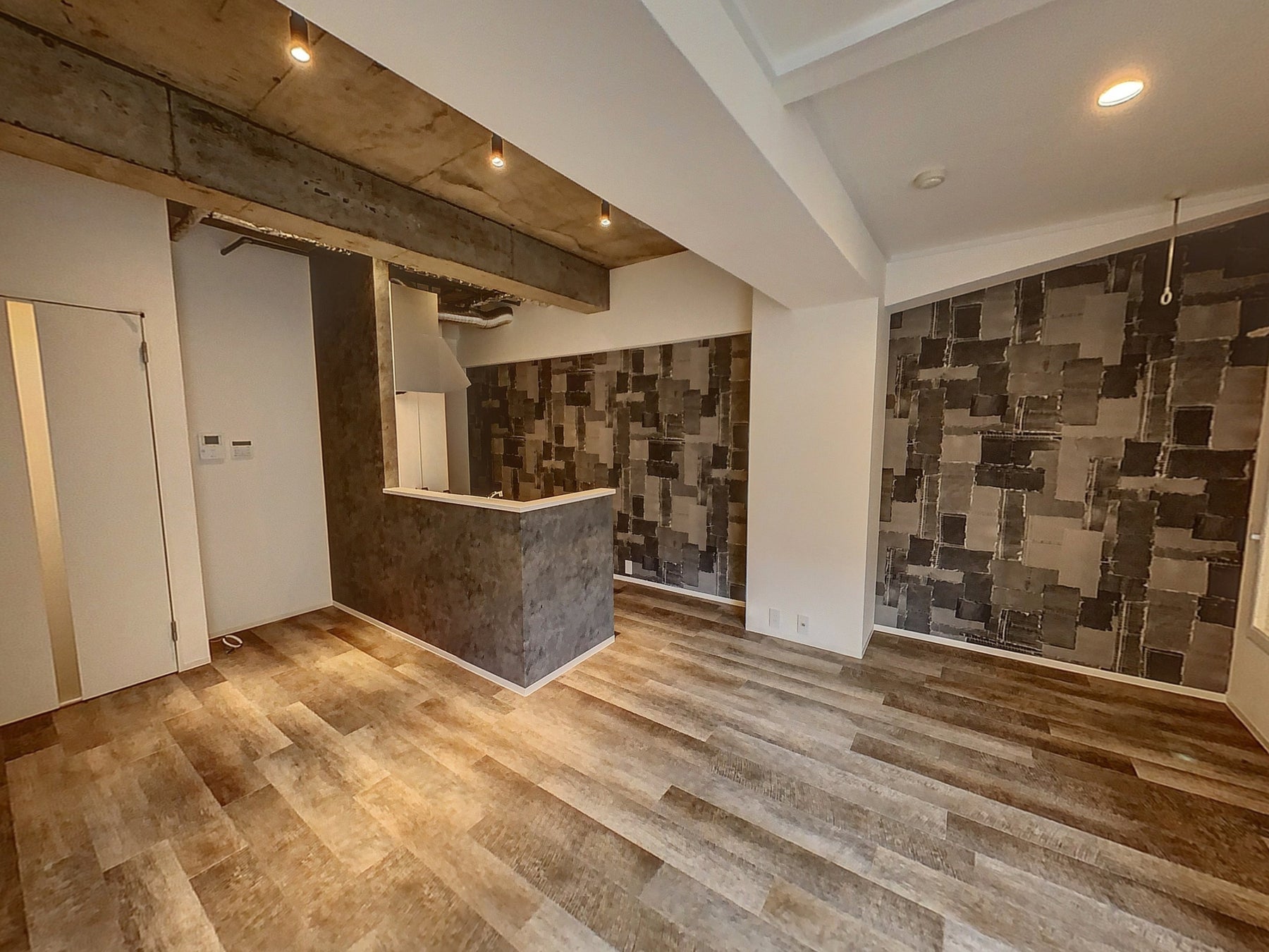 深みのある黒を基調としたパッチワークが特徴のお部屋。黒は無限の可能性を象徴し、さまざまな色や素材と組み合わせることで、その表情を一層際立たせます。フロアタイルもパッチワークのクロスに合うようロイヤルウッドな材質を2種類採用。