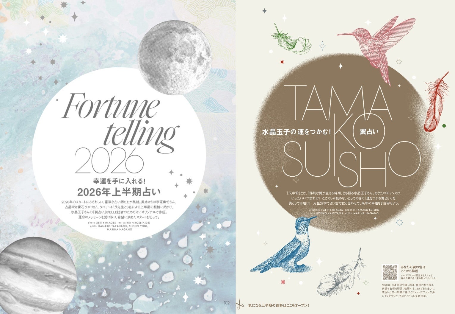 豪華占い師たちがエルに集結!風水の李家幽竹さん、占星術の青石ひかりさん、タロットのミラ先生による上半期の総論にはじまり、水晶玉子さんの 「翼占い」はエルのためだけにオリジナルで作成したスペシャル版を、袋綴じ付録でお届け。