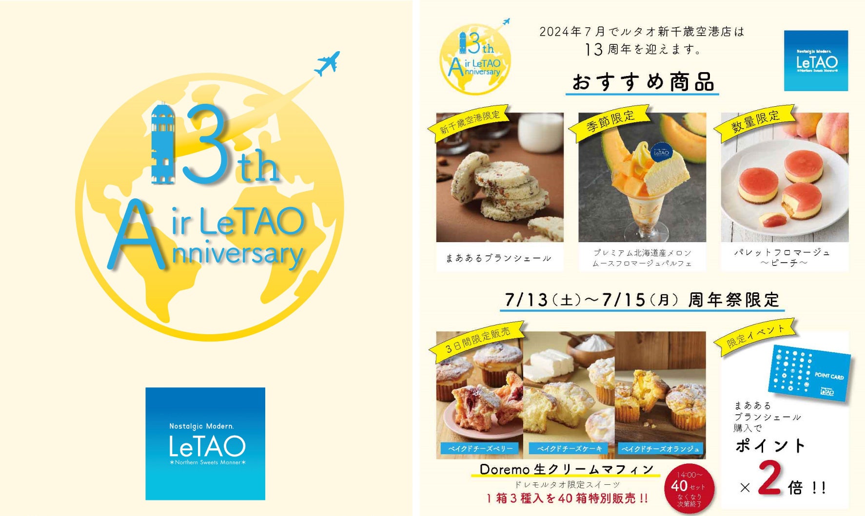 ルタオ新千歳空港店は2024年7月15日で当店は13周年を迎えます。2024年7月13日~15日の3日間、お客様への感謝の気持ちを込め周年祭を開催いたします。