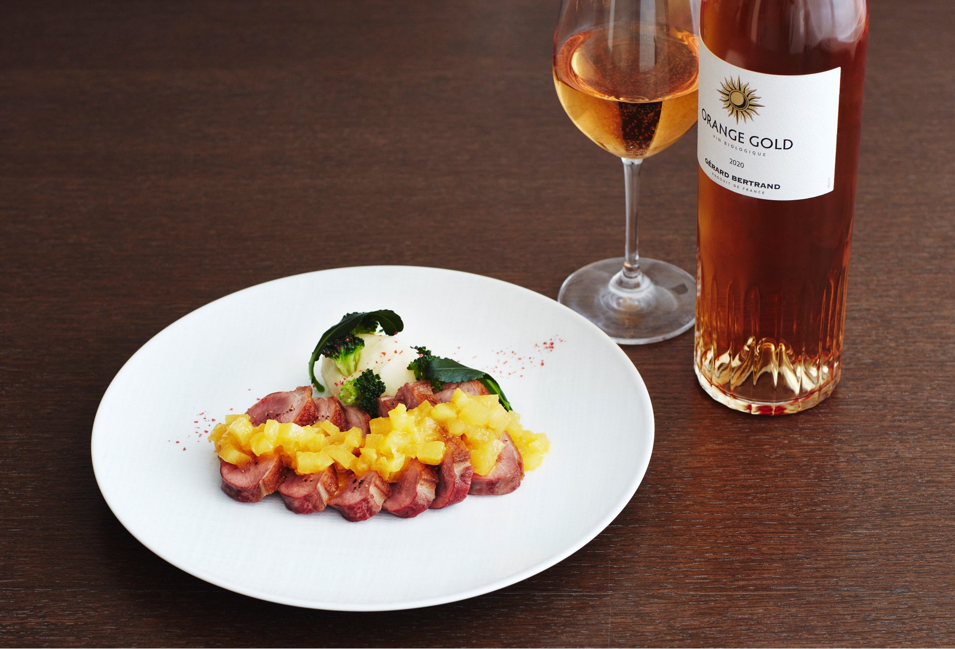 産地が異なる鴨肉の味わいの違いをお楽しみいただけます。鴨肉の独特の味わいを活かすアップルジンジャーソースのレシピと、鴨肉の濃厚な味わいとバランスがいい白ブドウを赤ワインの製法で醸造したオレンジワインがセットになっています