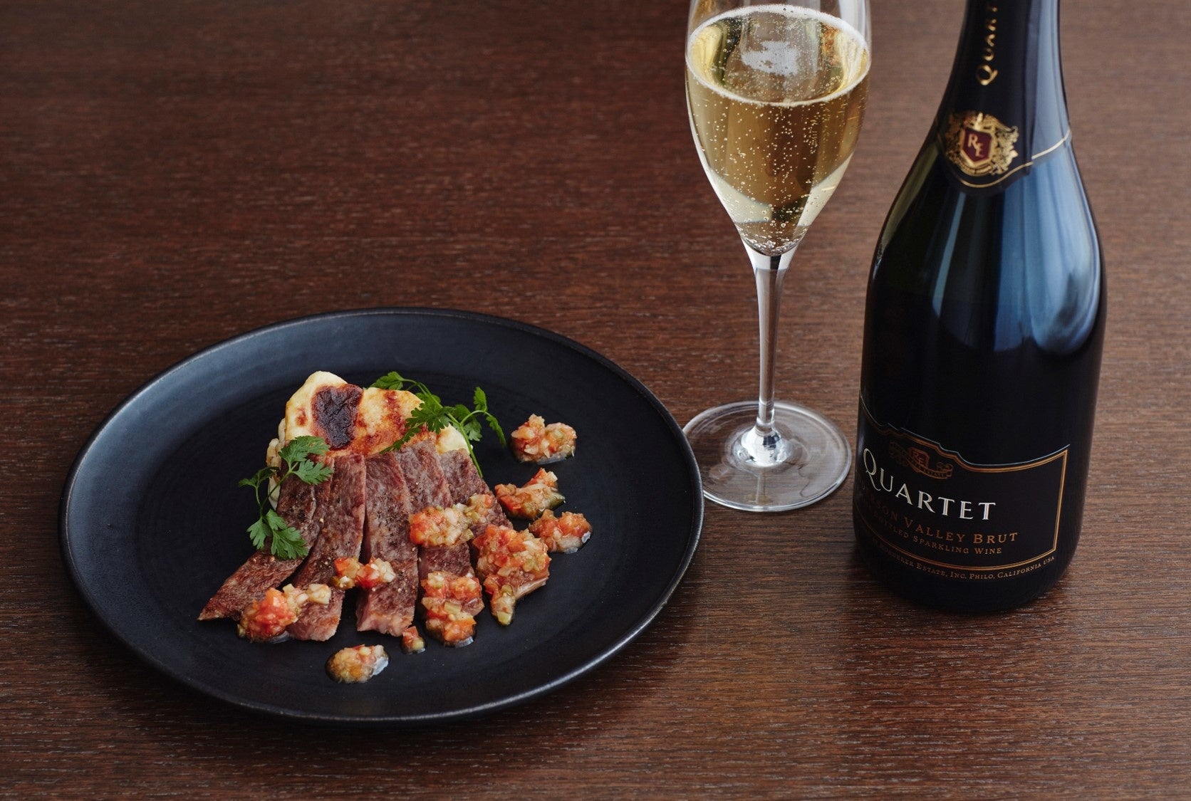 日米最高ランクの牛肉の食べ比べをお楽しみいただけます。サシの強い牛肉を活かすための、あっさりとしたラヴィゴットソースのレシピと、脂の多いお肉を最後までおいしくお召し上がりいただけるカリフォルニアのスパークリングワインのセットです。