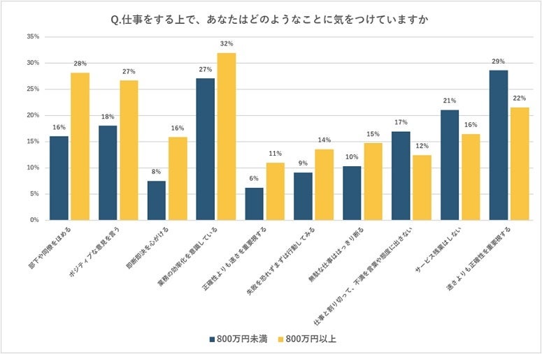 仕事をする上で気をつけていることについて、ハイクラス人材は、「部下や同僚を褒める」、「ポジティブな意見を言う」、「即断即決」、「業務の効率化」といった項目で年収800万未満の人材と比較して高い割合だった。一方で「速さよりも正確性を重要視する」と答えた割合は、年収800万未満の人材の方が高かった。