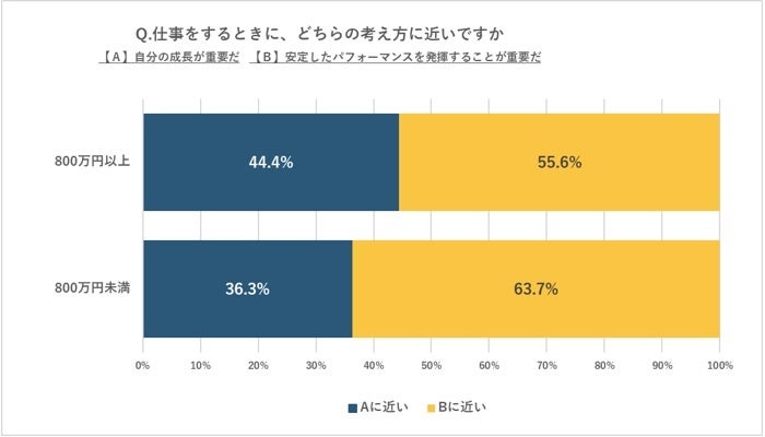 ●ハイクラス人材は、「自分の成長」と「安定したパフォーマンスの発揮」を比較した時に「自分の成長」と答えた割合が44.4%、「安定したパフォーマンスの発揮」と答えた割合が55.6%だった。一方、年収800万未満の人材は、「自分の成長」と答えた割合が36.3%、「安定したパフォーマンスの発揮」と答えた人が63.7%だった。