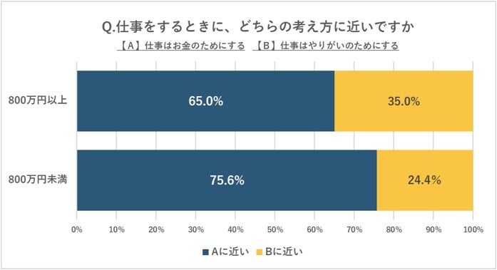 ●ハイクラス人材は、「仕事はお金のためにする」と「仕事はやりがいのためにする」を比較した時に、「お金のためにする」と回答した割合が65.0%、「やりがいのためにする」と回答した割合が35.0%だった。一方、年収800万未満の人材は、「お金のためにする」と答えた割合が75.6%、「やりがいのためにする」と答えた人が24.4%だった。
