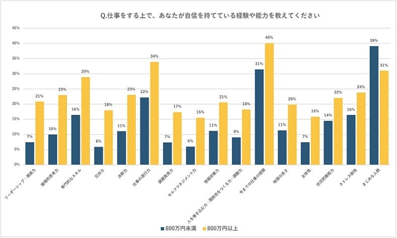 仕事をするうえであなたが自信を持てている経験や能力について、ハイクラス人材は、「リーダーシップ・推進力」、「論理的思考力」、「専門的なスキル」、「交渉力」といった多くの項目で年収800万未満の人材よりも高い割合を示した。一方で「まじめな人柄」と答えた割合は年収800万未満の人材の方が高かった。