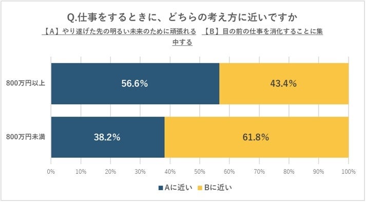 ●ハイクラス人材は、「やり遂げた先の明るい未来のために頑張れる」と「目の前の仕事を消化することに集中する」を比較した時に、「明るい未来のため」と回答した割合が56.6%、「目の前の仕事」と回答した割合が43.4%だった。一方、年収800万未満の人材は、「明るい未来のため」と答えた割合が38.2%、「目の前の仕事」と答えた人が61.8%だった。