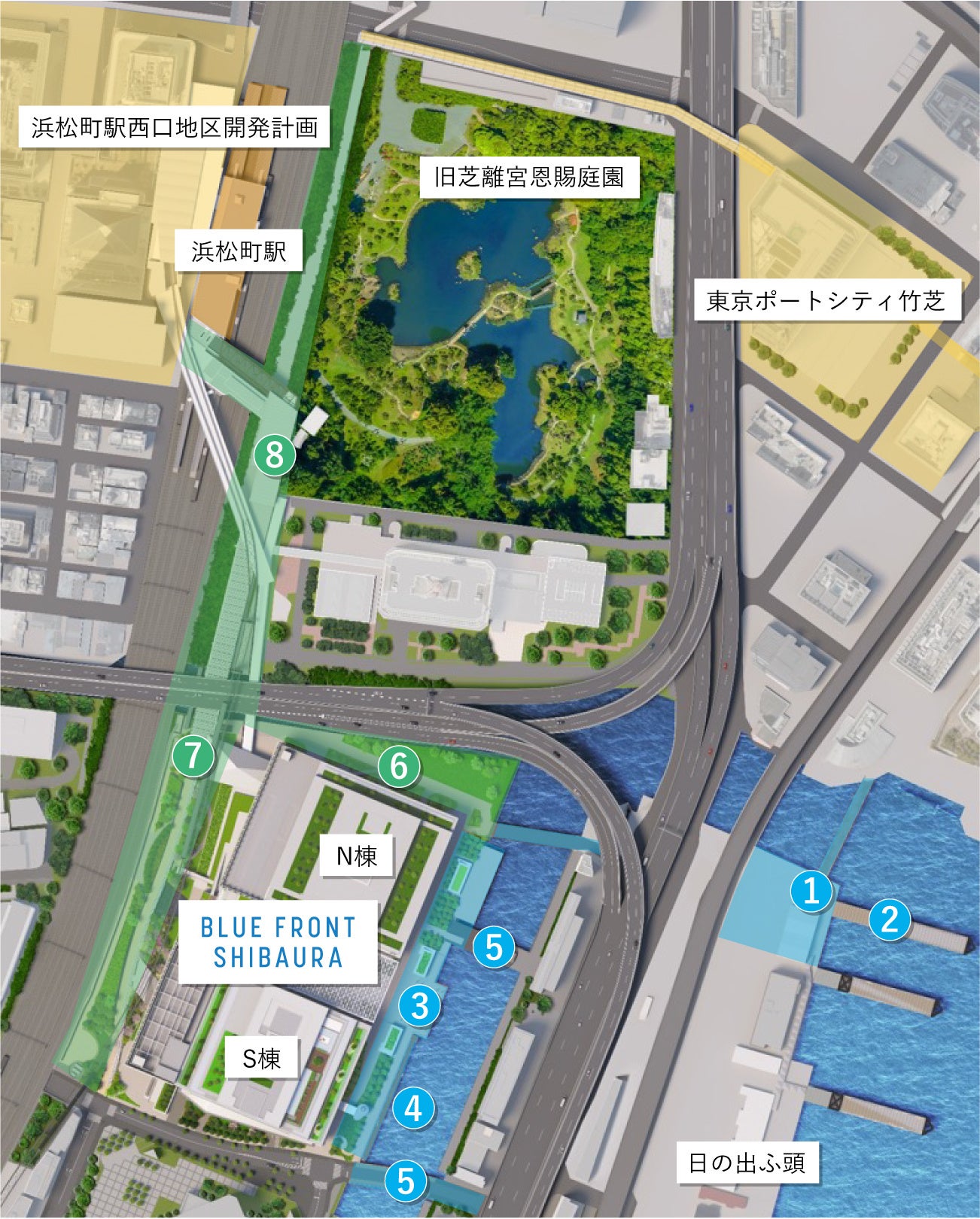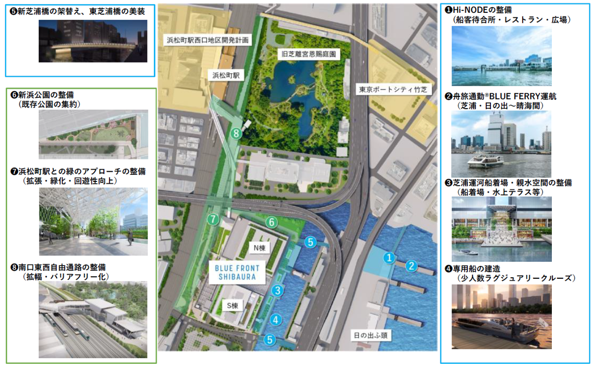 また、羽田空港から都心部への玄関口である「浜松町駅周辺エリア」は、今後複数の大規模開発が進むことで、観光客等の来街者及び就労人口の増加が見込まれる注目すべきエリアです。2025年春頃には本プロジェクトと、「浜松町駅との緑のアプローチ」が開通し、利便性が向上します。主要鉄道駅から水辺へのアクセスを改善することにより、ベイエリアと東京都心部をつなぐことを実践していきます。(下記、図2の5~8参照)