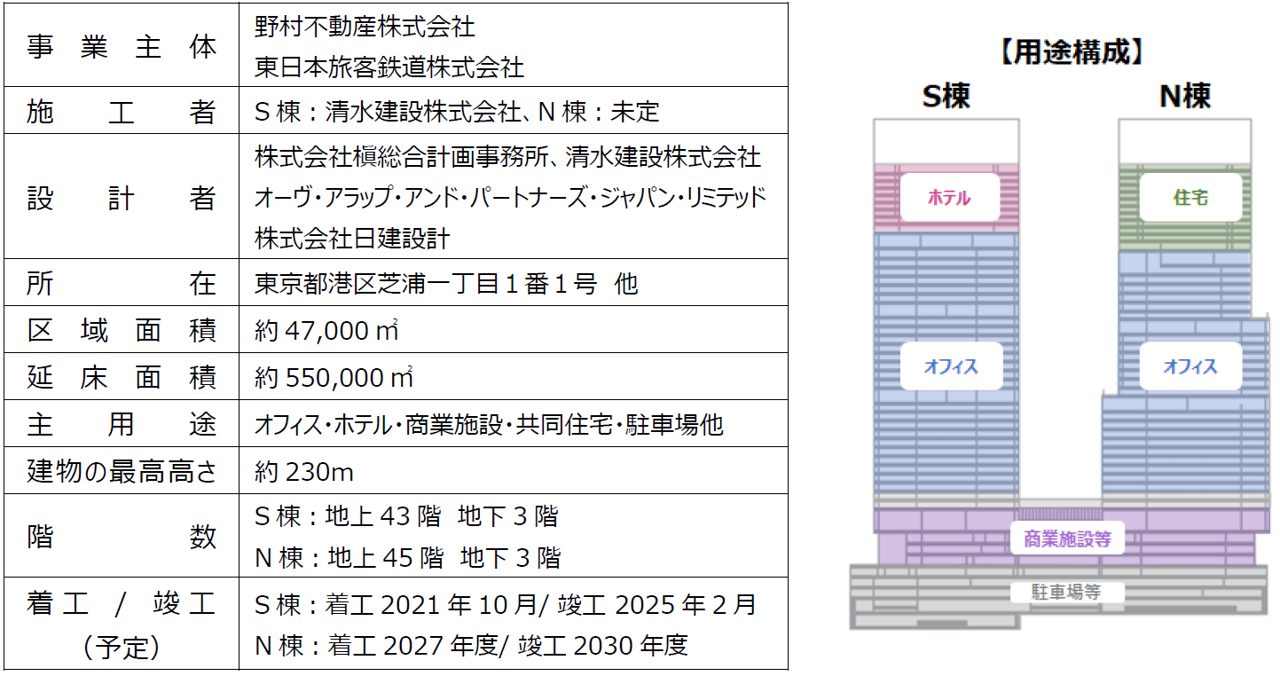 本プロジェクトは、浜松町ビルディング(東芝ビルディング:東京都港区芝浦1-1-1)の建替事業として、高さ約230mのツインタワーの建設を予定しています(S棟:2025年2月竣工予定、N棟:2030年度竣工予定)。区域面積約4.7ha、延床面積約55万㎡の、オフィス・ホテル・商業施設・住宅を含む、約10年間に及ぶ大規模複合開発です。
