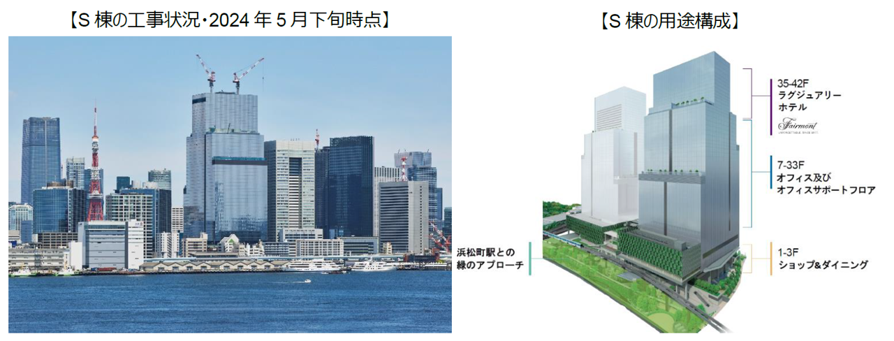 ツインタワーの1棟目であるS棟は、2024年3月に上棟を迎え、2025年2月の竣工に向けて工事を推進しております。S棟は主に「ラグジュアリーホテル」、「オフィス」、「商業施設」から構成されています。