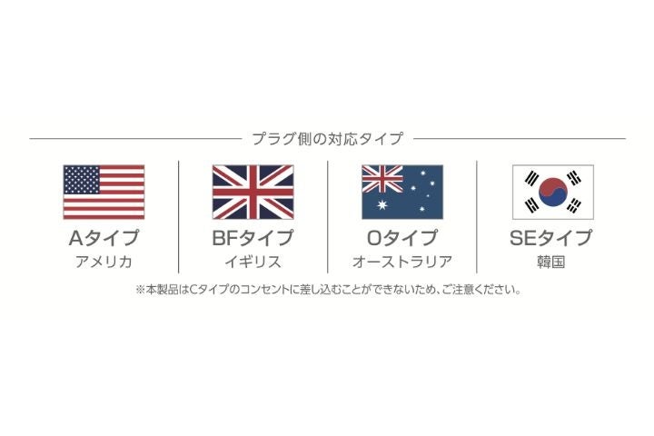 ■主要対応国:Aタイプ(アメリカ、カナダ、台湾など)、BFタイプ(イギリス、香港、シンガポールなど)、Oタイプ(オーストラリア、中国、ニュージーランドなど)、SEタイプ(韓国、ドイツ、フランスなど) ※2024年9月現在、当社調べ