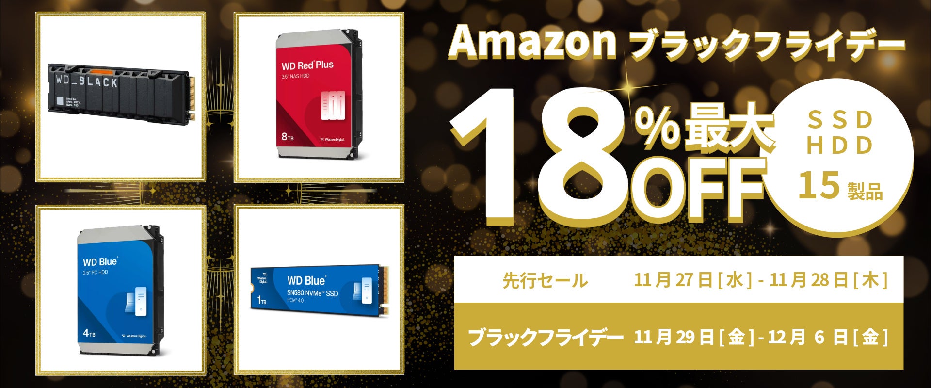 2024年11月29日(金)0:00から12月6日(金)23:59までAmazonで開催される「ブラックフライデー」と、11月27日(水)から開催される「ブラックフライデー先行セール」において、CFD販売が代理店を務めますWesternDigitalブランドの人気製品が最大18%OFFとなる特別セールを実施します。