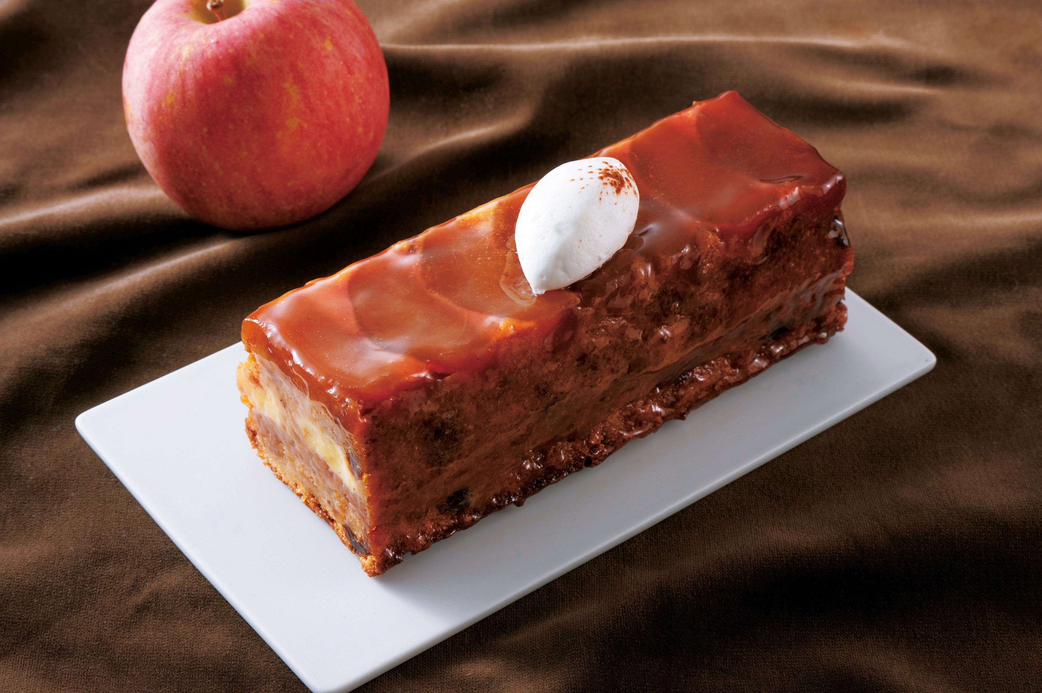 リンゴのキャラメル煮を丁寧に敷き詰め、ラム酒に漬け込んだレーズン、アーモンド、リンゴをパウンド生地に混ぜ込み、カスタードクリームとシナモンシュトロイゼルを入れて焼き上げました。