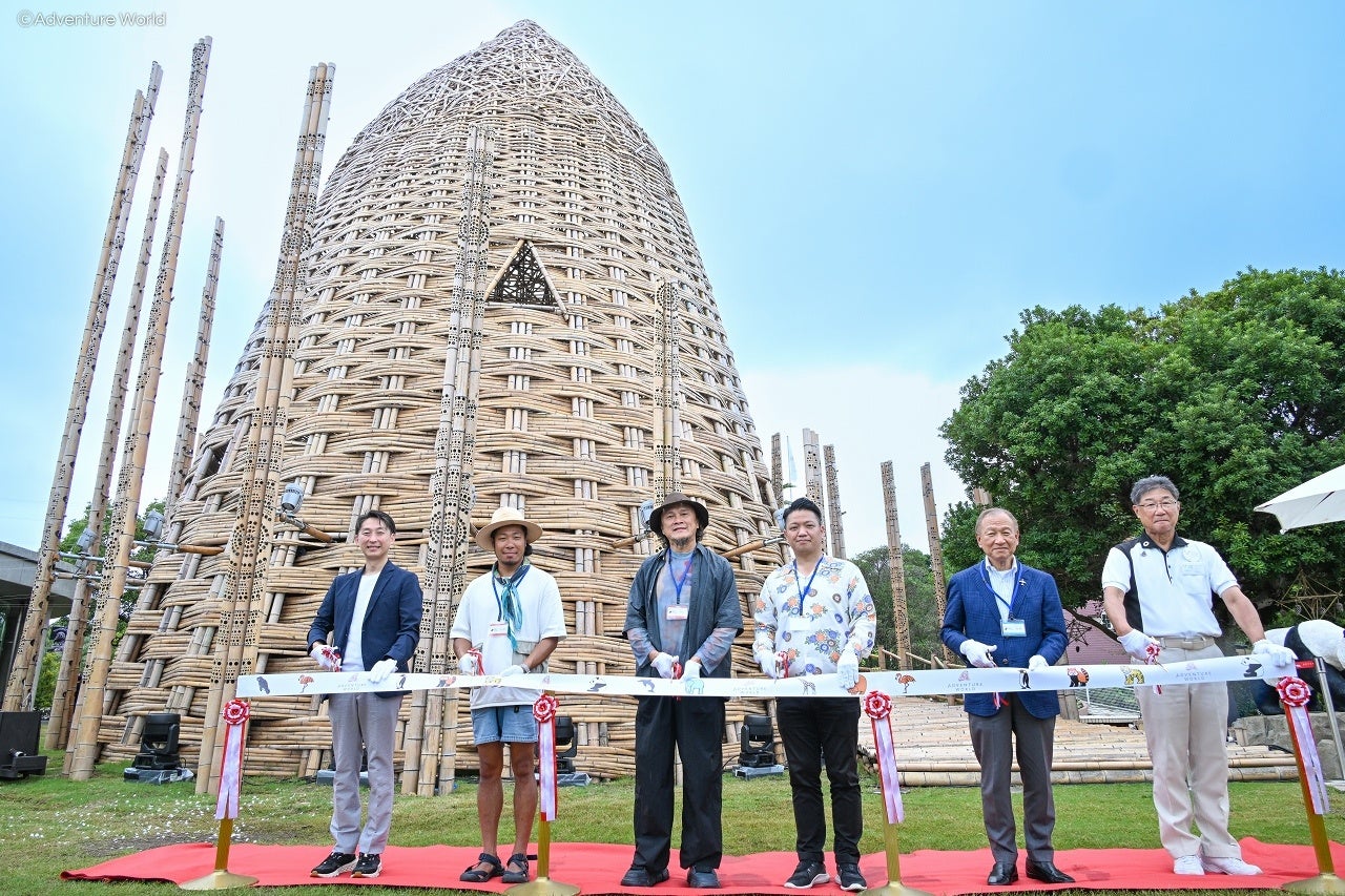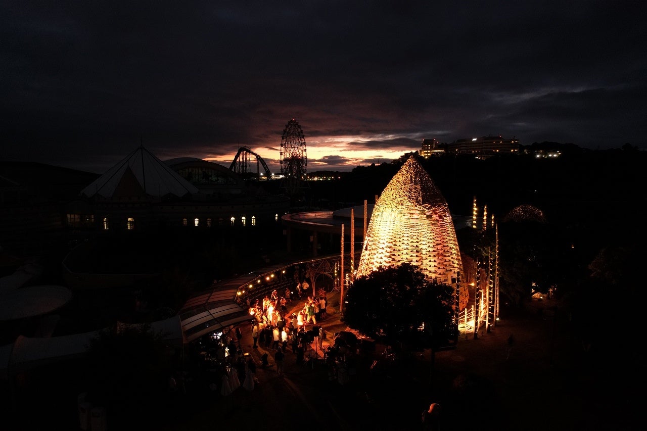 記念イベントではワン・ウェンチー 氏や池田親生 氏らによるトークイベント、舞踊パフォーマンスなどが行われ、パーク来場者に向けた一般公開もスタートしました。トークイベントでは、本アート作品「きらめく丘」が、大小2つの竹のドームとそれをつなぐ竹の回廊で構成されており、和歌山の雄大に連なる山々を表現されていること、そして、自然の竹で編まれた小ドームは「PLAY・あそび」、大ドームは「PRAY・祈り」の空間として、「動」と「静」が調和する場となり、訪れた人々がつながり、人・動物・自然、すべての生き物が調和する豊かな世界を願いともに問い続ける場所にしていくことが、語られました。