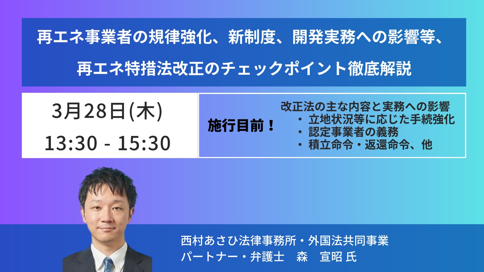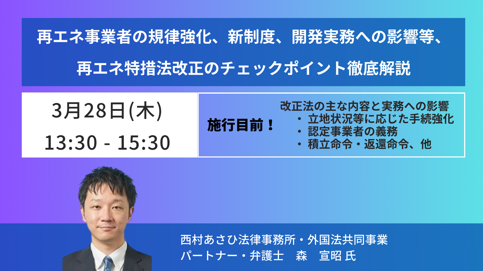 【JPIセミナー】施行目前!「再エネ事業者の規律強化、新制度、開発実務への影響等、再エネ特措法改正のチェックポイント徹底解説」3月28日(木)開催