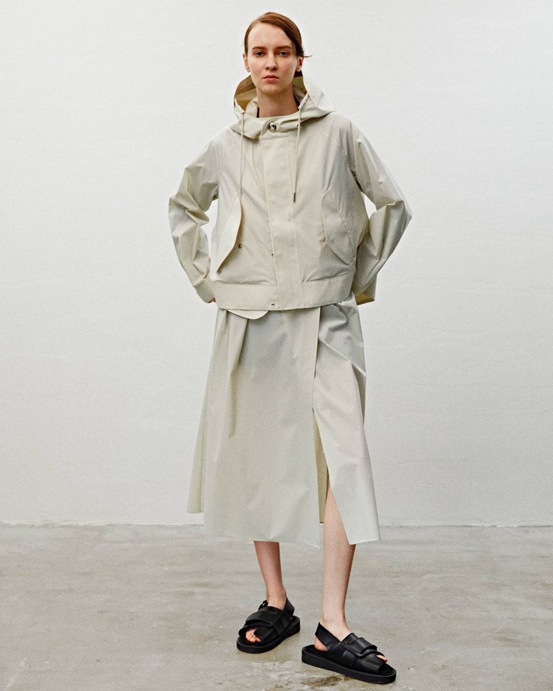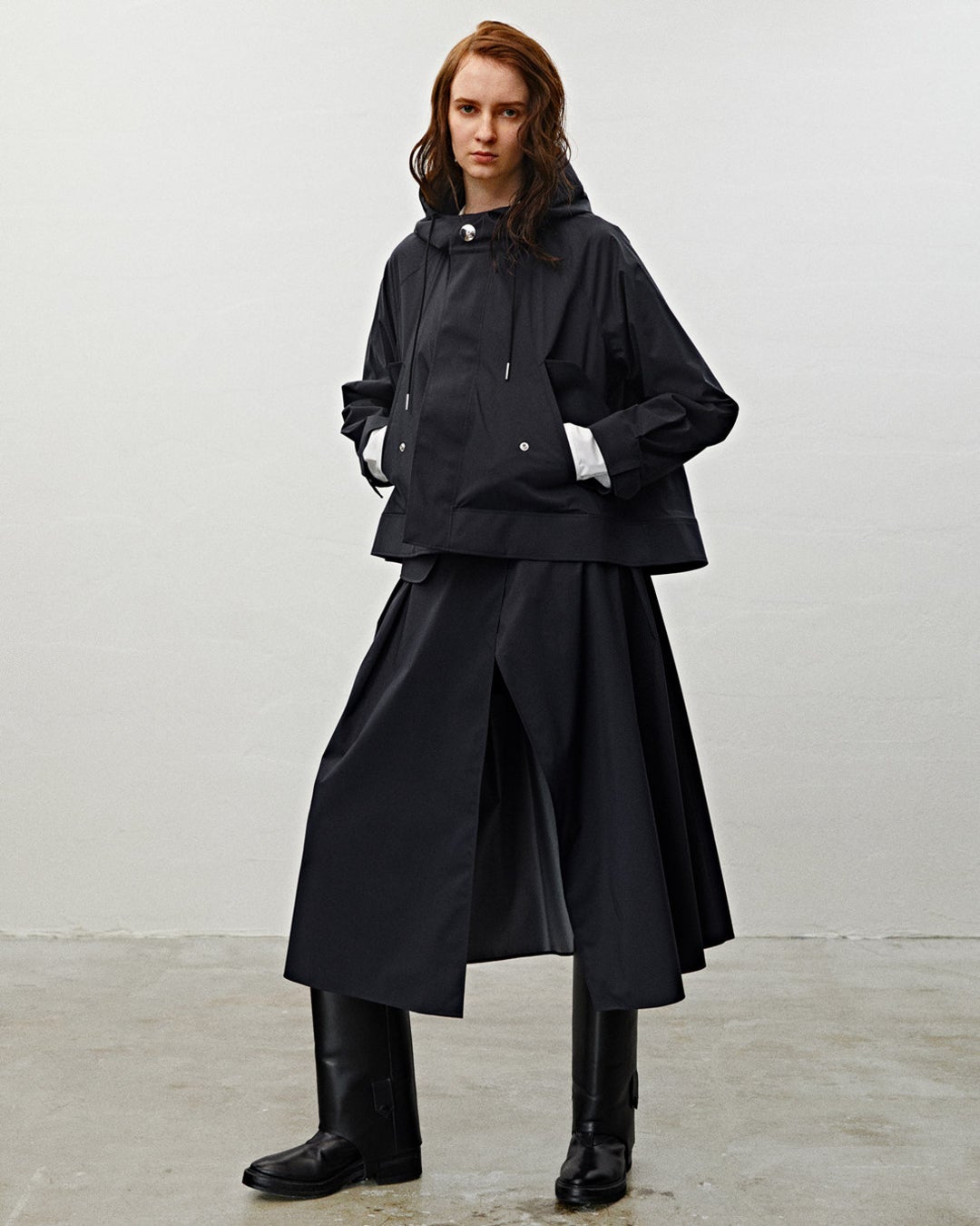 モッズコートは、本体と一体型になったフードとラグランスリーブ仕様でコンパクトなサイズ感。裾幅はダイナミックな寸法でAラインを強調するシルエットに。