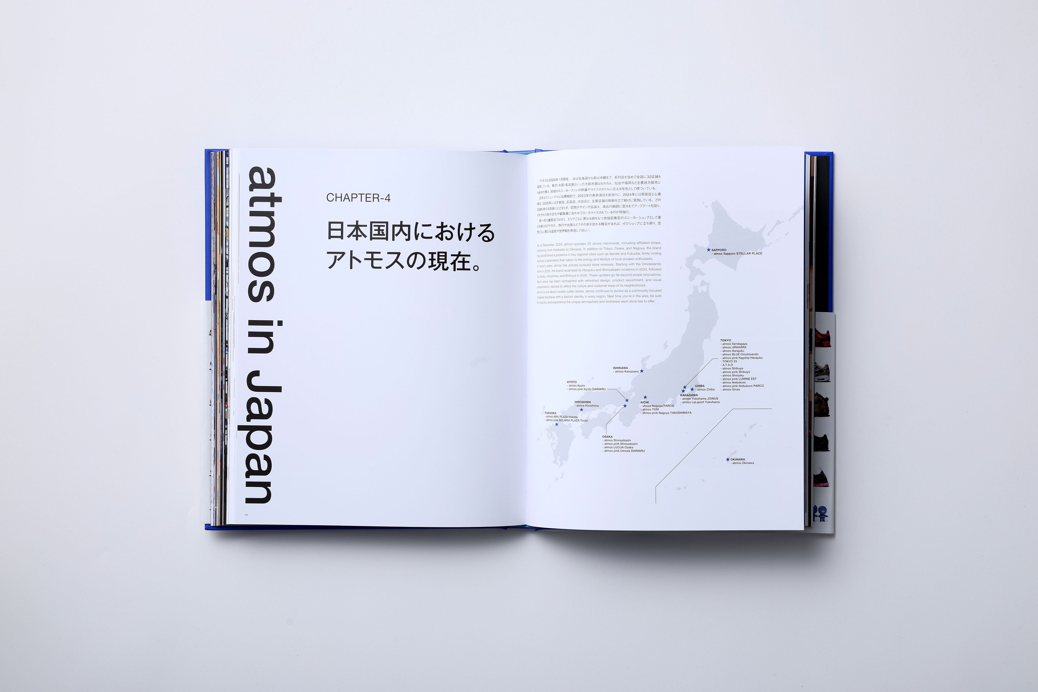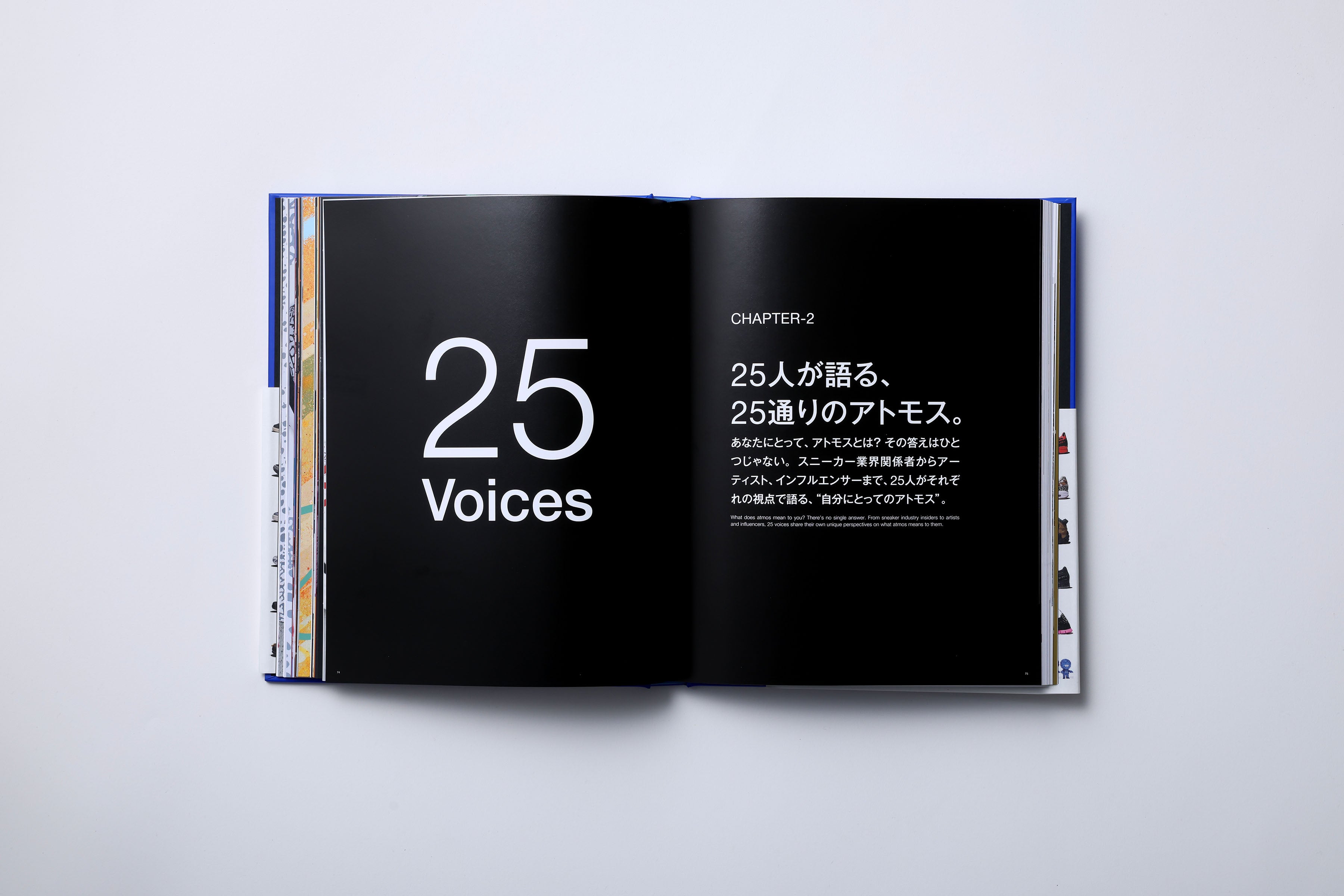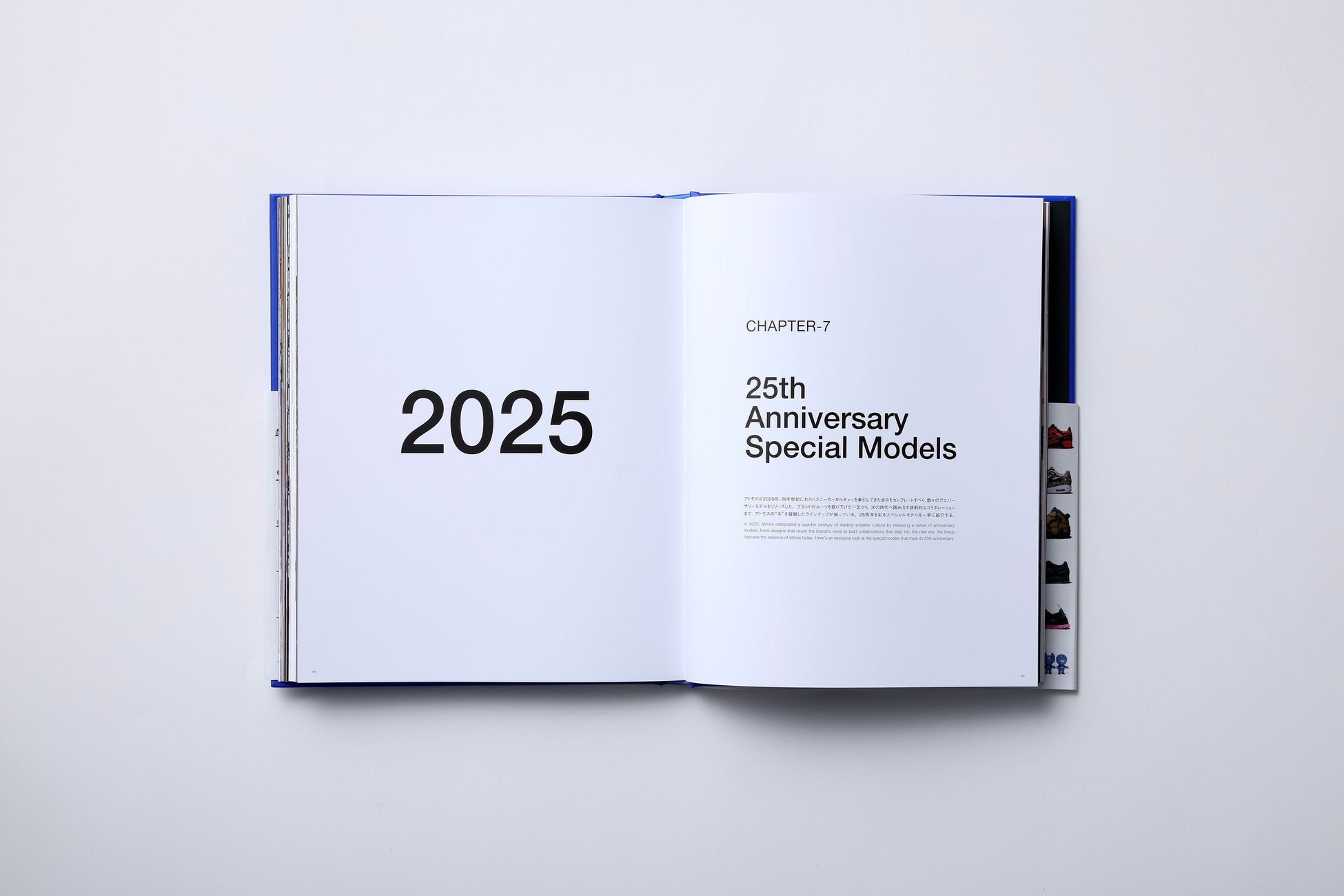 今回の記念ブックでは、歴代のコラボレーションモデルや別注モデル、所縁ある25名の方のインタビュー、国内外店舗の最新事情、2000年のオープンから現在までの歴史の振り返り、プロダクト&クリエイティブ シニアディレクター小島による「atmos」のこれまでとこれから、などのコンテンツで制作された、全216ページになっております。
