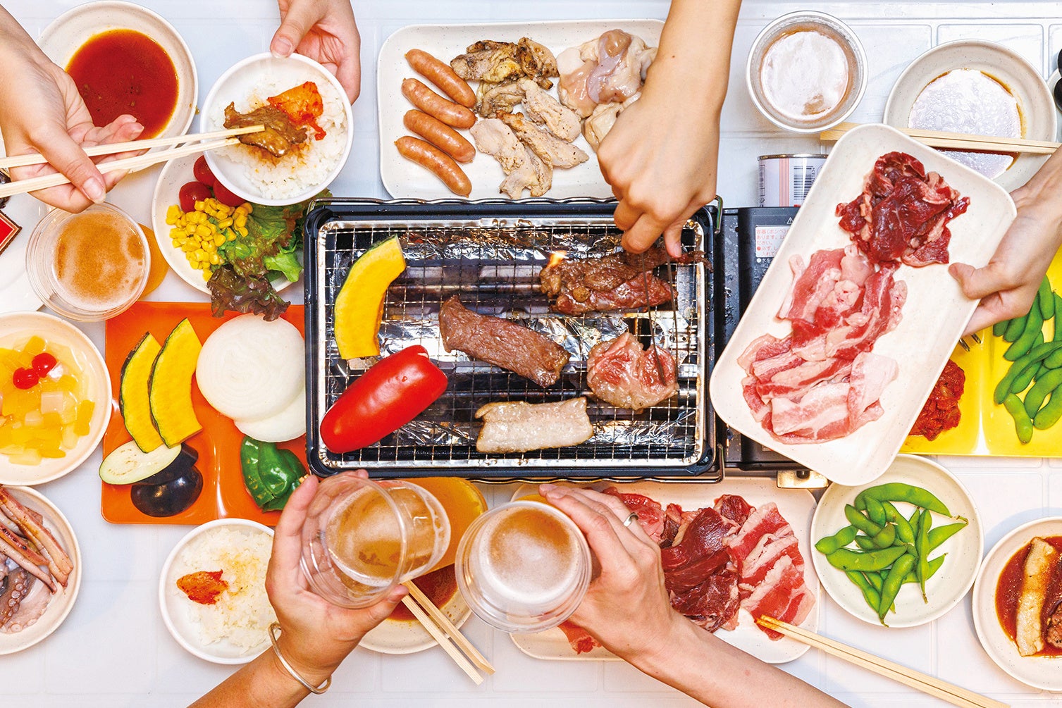 牛肉・豚肉・鶏肉・ソーセージ・焼きイカ・海老・ししゃも、焼き野菜などお好きなものをお選びください。
