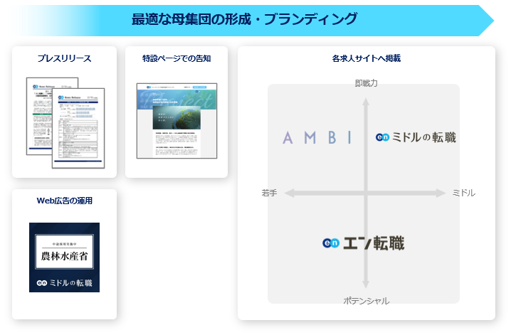 プレスリリースや特設ページ、Web広告での告知に加え、各求人サイトでの集客支援を実施。『エン転職』『AMBI』『ミドルの転職』とターゲットの異なる求人サイトを活用することで、ターゲットへ網羅的に求人を届けます。