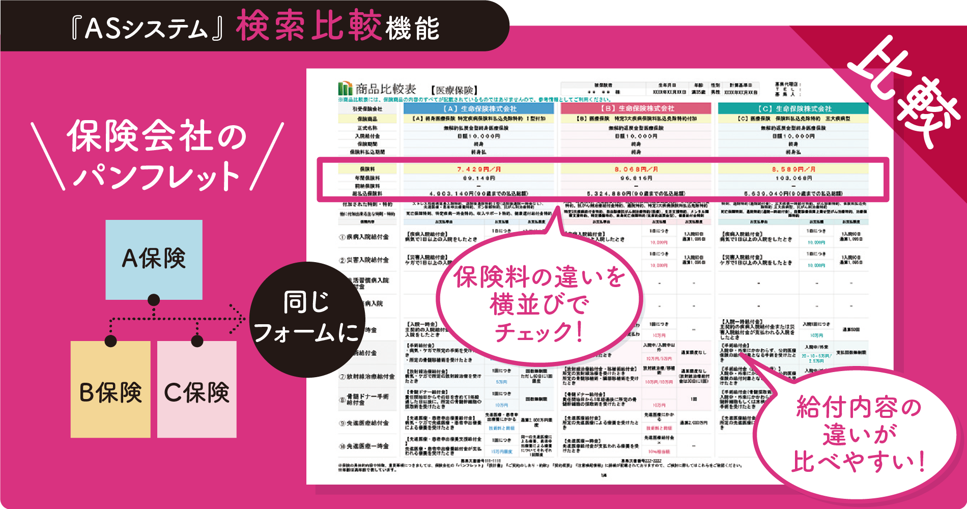 お客様のご希望をもとに保険商品を検索し、その中からさらにお客様のご希望に沿った複数の保険商品を同じフォーマットで並べた比較表をお出しします。別々の保険会社・保険商品で並べたり、同じ保険商品の中でも保障額や特約を変更して並べることもできます。