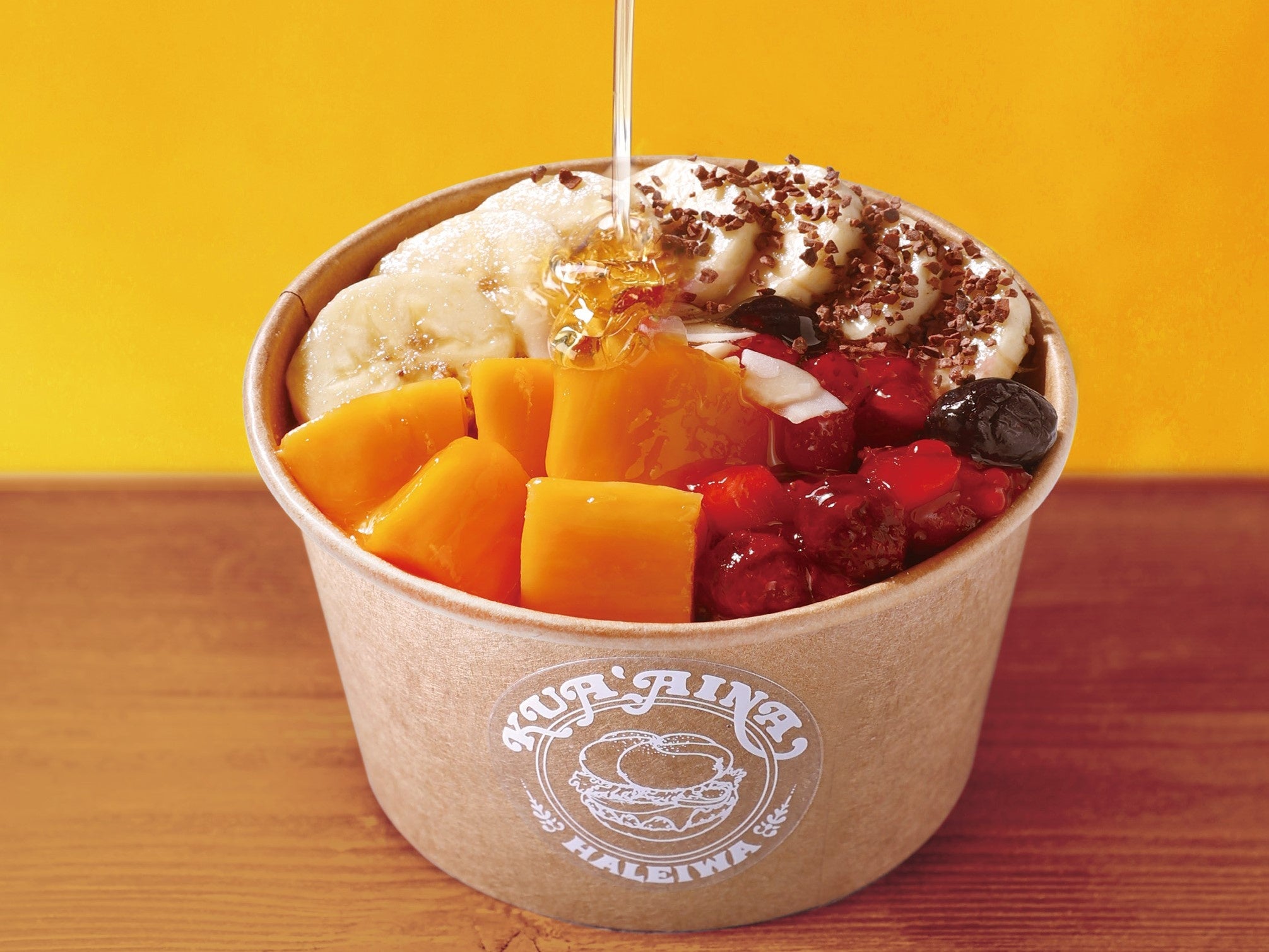 マンゴー・バナナ・ストロベリーなど全5種のフルーツにココナッツチップ、カカオニブにハチミツが付いて栄養たっぷり!ブランチやおやつにぴったりのハワイ定番スイーツです。
