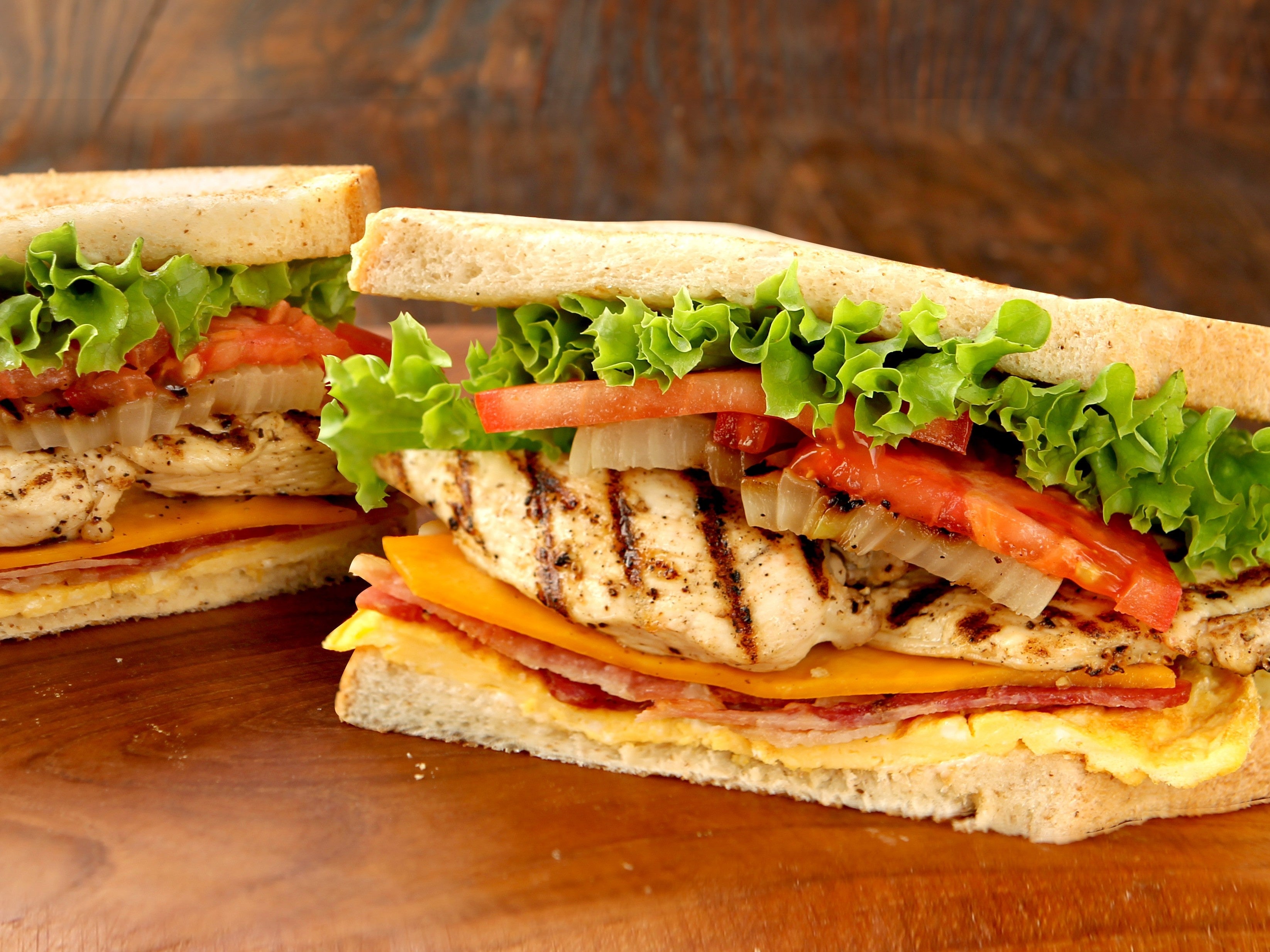 クア・アイナならではのグリルチキン、ベーコン、レタス、トマト、スライスオニオン、薄焼き卵、