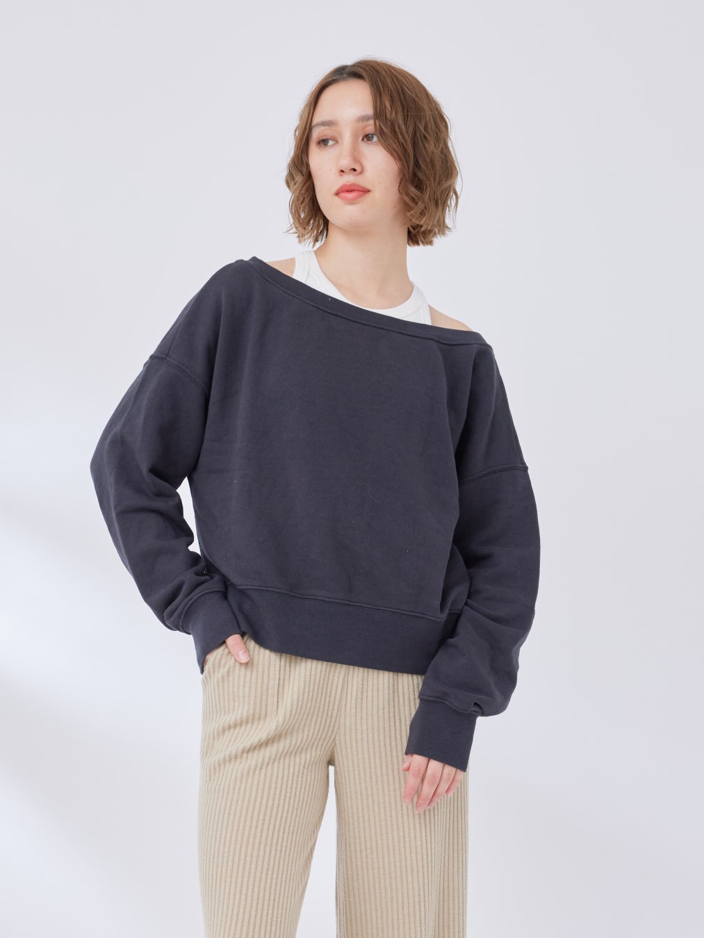 オフショルダーのネックラインが特徴的にデザインされたスウェットアイテム。