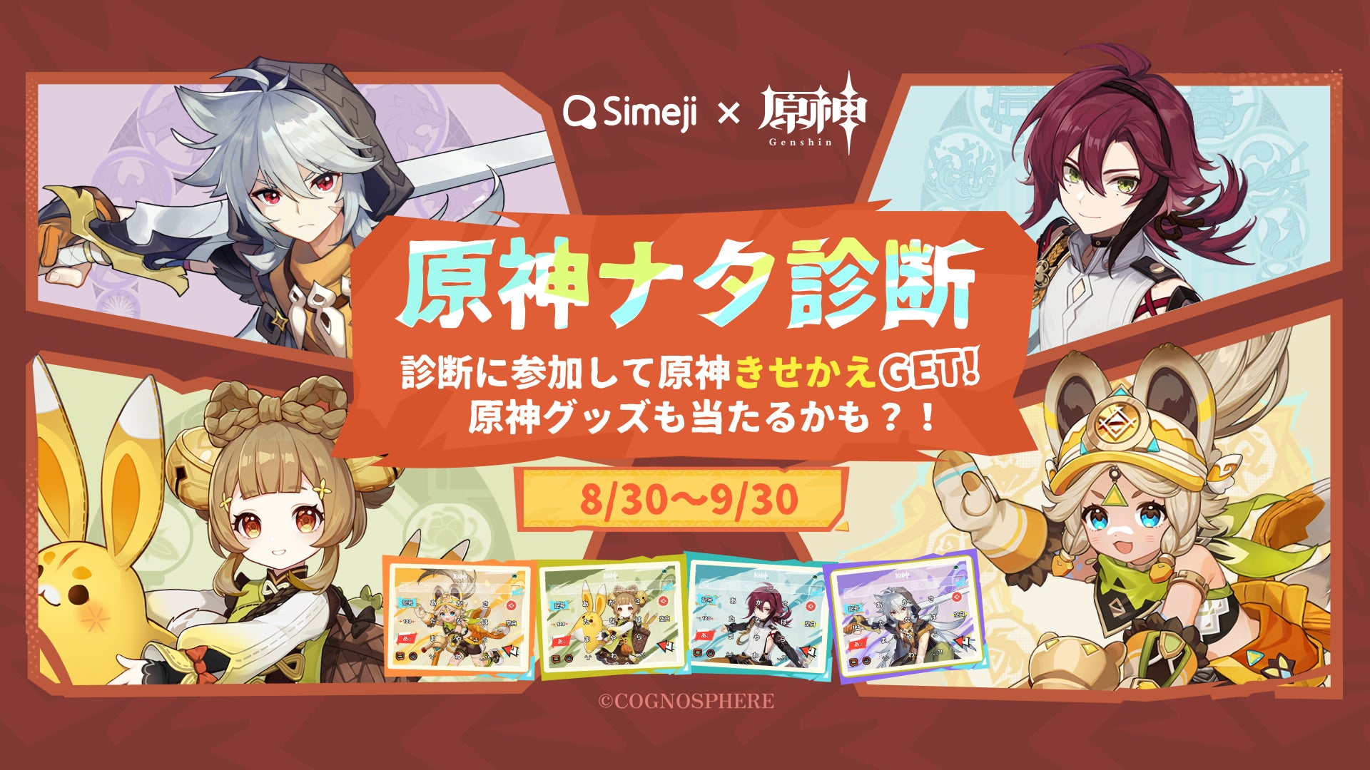 あなたの冒険仲間は誰でしょうか?自分のニックネームを入力するだけで診断できる!診断結果をXでシェアすると「原神」×Simejiコラボ限定オリジナルきせかえがGETできます!さらに、抽選30名様に原神公式グッズをプレゼント!ぜひお楽しみください。