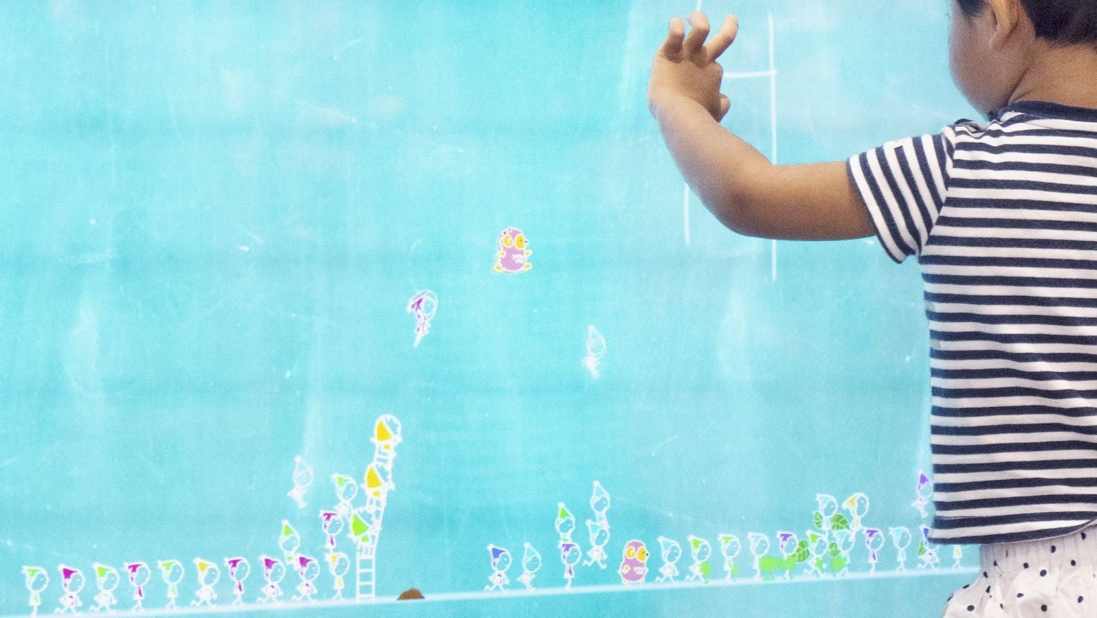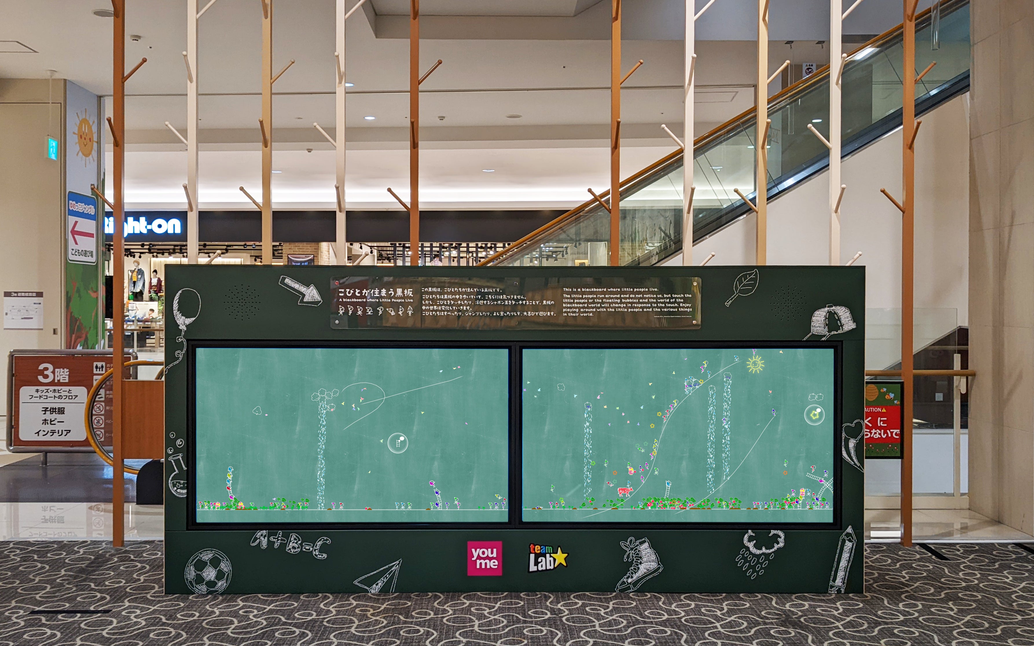 ゆめタウン廿日市とゆめタウン広島の《こびとが住まう黒板》の中には、ゆめタウンのキャラクター「ユーくん&メーちゃん」がこびとと一緒に住んでいます。黒板の中のこびとやユーくん、メーちゃん、シャボン玉などにタッチしたり、線を引いたりすると、インタラクティブに世界が変化していきます。