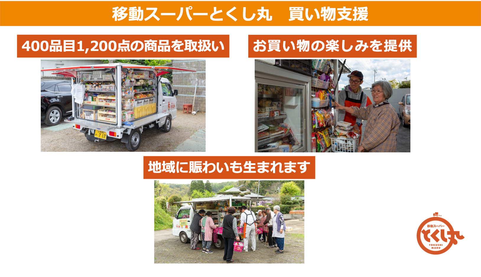 軽トラックでの移動スーパー事業を全国展開し、高齢者など店舗での購入が困難な住民の買い物を支援しており「街のインフラ」となって住みやすい街づくりに貢献している。個人商店との共存を目指した配慮や、自治体と連携して見守り活動を行い対面で接する消費者の体調変化に気を配るなど、地域課題の解決に寄与している。