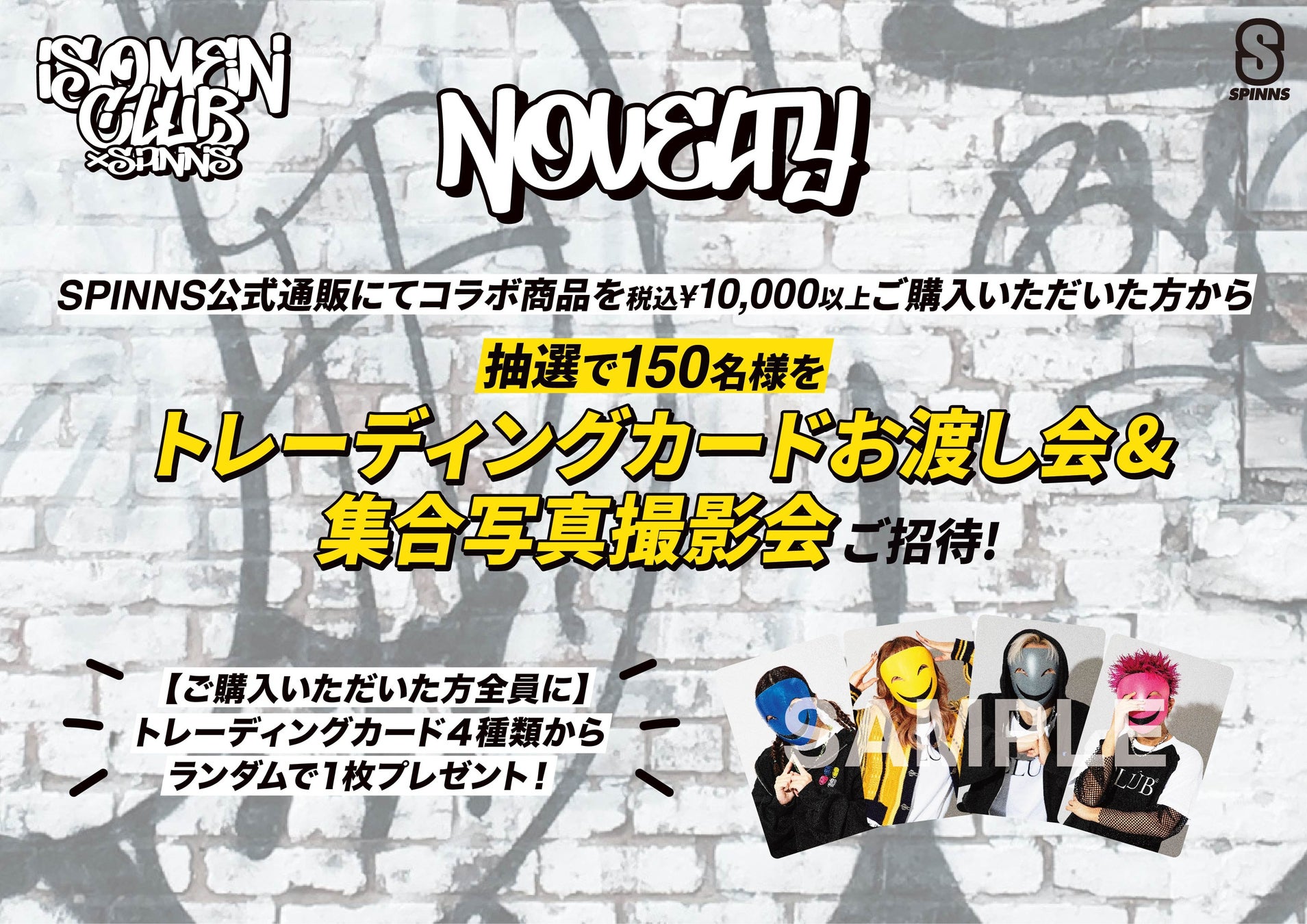 ▪トレーディングカードお渡し会&集合写真撮影会:SPINNS公式通販にてコラボ商品を税込10,000円以上ご購入いただいた方から抽選150名様をご招待します。