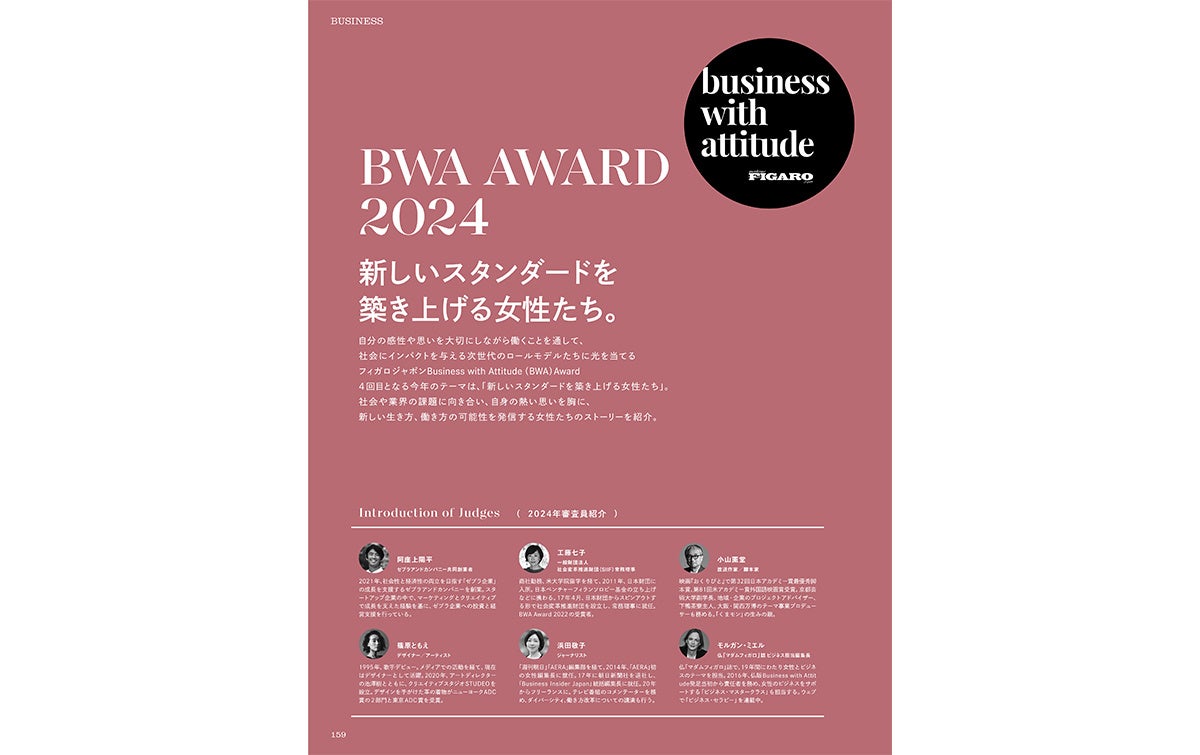 自分の感性や思いを大切にしながら働くことを通して、社会にインパクトを与える次世代のロールモデルたちに光を当てるフィガロジャポンBusiness with Attitude(BWA)Award。4回目となる今年のテーマは、「新しいスタンダードを築き上げる女性たち」。社会や業界の課題に向き合い、自身の熱い思いを胸に、新しい生き方、働き方の可能性を発信する女性たちのストーリーを紹介。