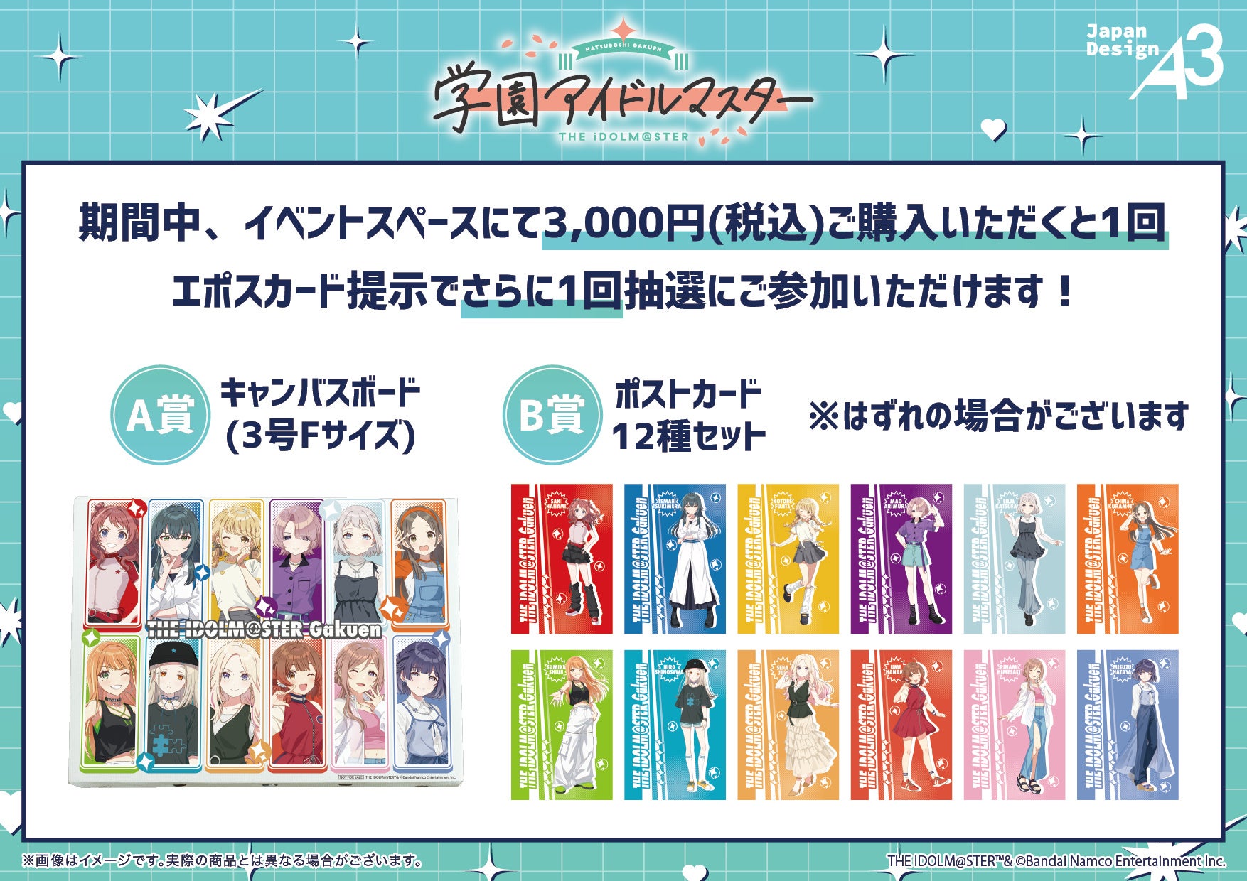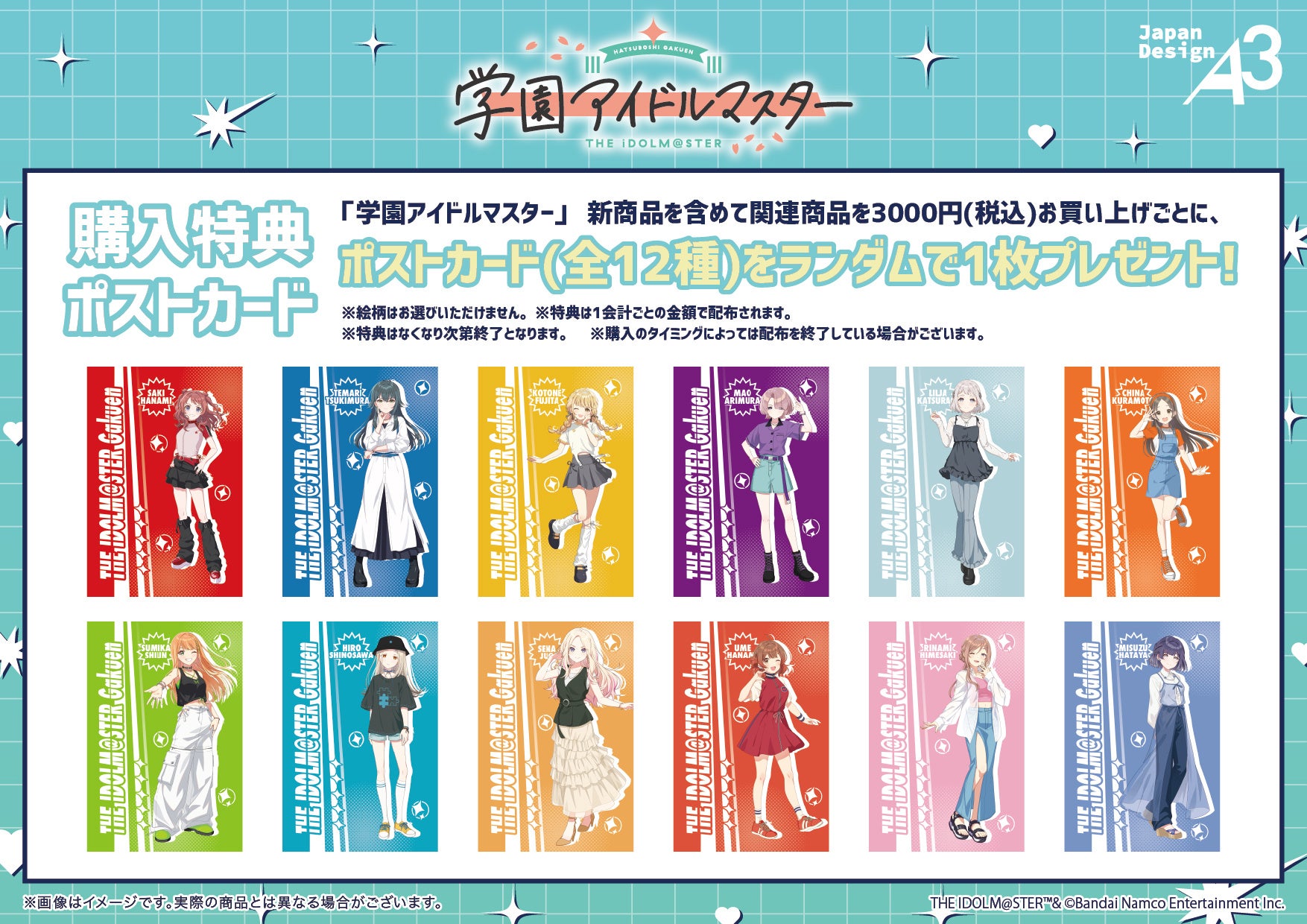 『学園アイドルマスター』POP UP SHOPにて新商品を含む関連商品を3,000円(税込)お買い上げごとに、購入特典としてポストカード(全12種)をランダムで1枚プレゼント。