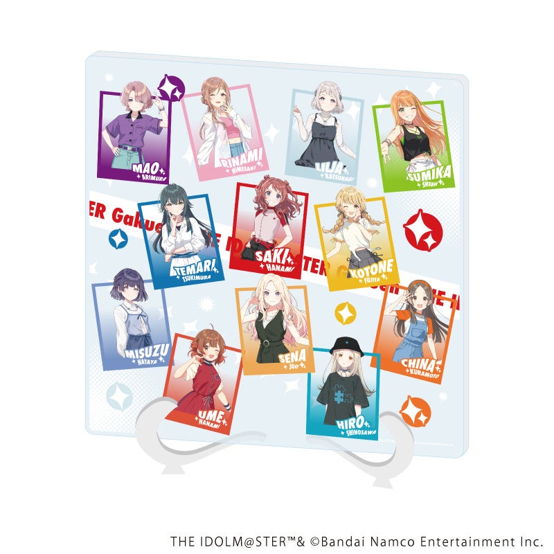 贅沢にも12人を1枚絵で楽しめる、およそ21cm×15cmの大きさのアクリルアートボード。付属の台座を使うことで、机や棚などに立てて飾ることのできるグッズです。