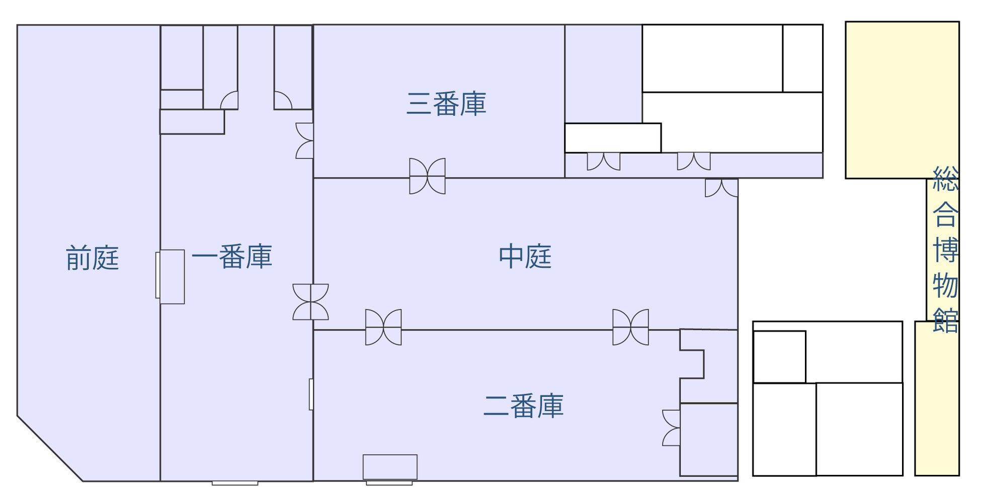 当該施設は、総床面積1,726㎡という広大な敷地を有し、一番庫・二番庫・三番庫・中庭・前庭というエリアに分かれてり、現在の予定では以下のように運営を想定しています。