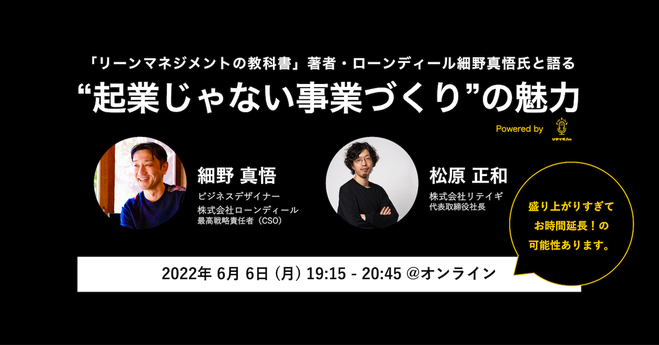 | 名称 | 「リーンマネジメントの教科書」著者・ローンディール細野真悟氏と語る“起業じゃない事業づくり”の魅力 |