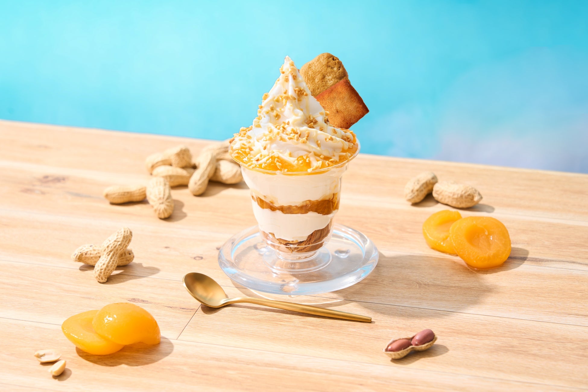 八街産ピーナッツを使用した、果肉入りのあんずソースの爽やかな酸味がミルクソフトクリームにぴったりのサンデー。人気商品の「ドレ・サブレ」「ドレ・フィナンシェ」をトッピングした、あんずと国産ピーナッツが出会ったフルーティでコクのある味わい。