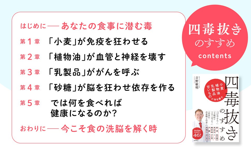 「四毒抜き」を試した人から反響が続々と寄せられおり、本書は予約開始後すぐ、Amazon(※)書籍売れ筋ランキングにて総合1位を獲得(カテゴリ 本 2025/5/30~6/9調べ)。「四毒」がなぜ私たちの健康を害すのか。 「四毒抜き」でなぜ健康になるのか。 「四毒抜き」の具体的な食事術とは。YouTubeフォロワー48万人(2025/6/17現在)の現役歯科医師 吉野敏明氏が解説する「四毒抜き食事法」の決定版となる一冊です。