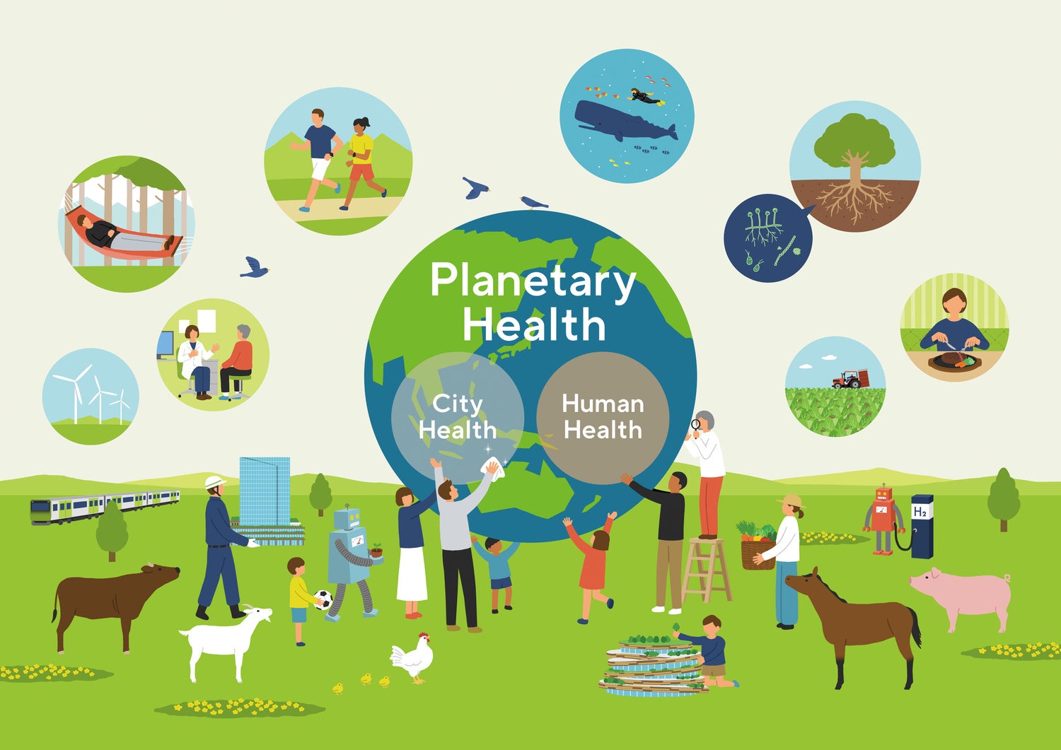 ※2 「PHD Lab.」で目指す「プラネタリーヘルス」とは、人の経済活動が、健康や都市環境、地球上の生物・自然に与える影響を分析し、「人・街・地球」の全てがバランスよく良好に保たれるようなくらしづくりを目指す考え方です。