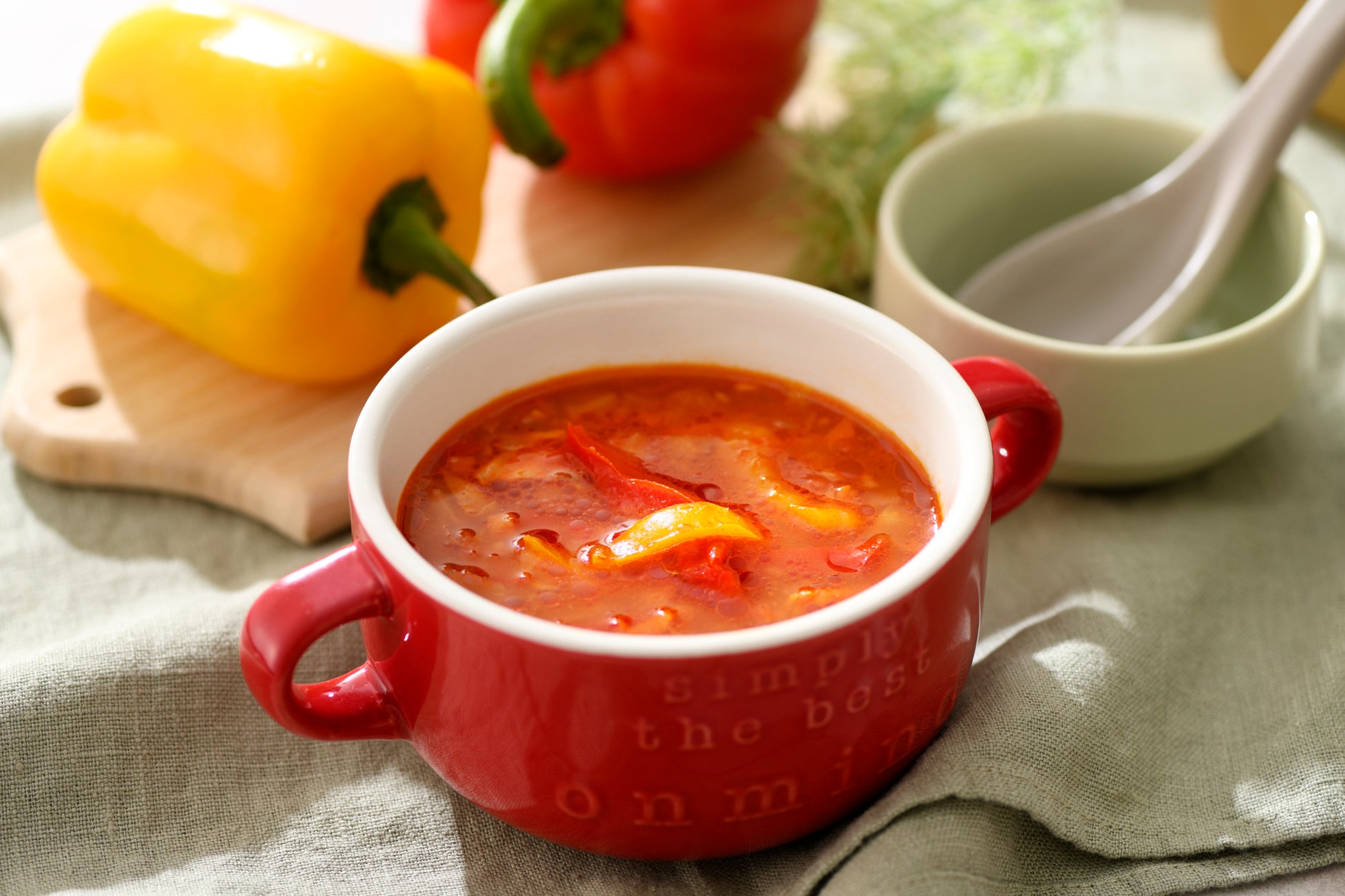 スペイン料理のアヒージョの風味を取り入れた、コク深いトマトベースのスープです。オリーブオイルとにんにくの香りが食欲をそそり、トマトの酸味と甘みが絶妙に調和しています。