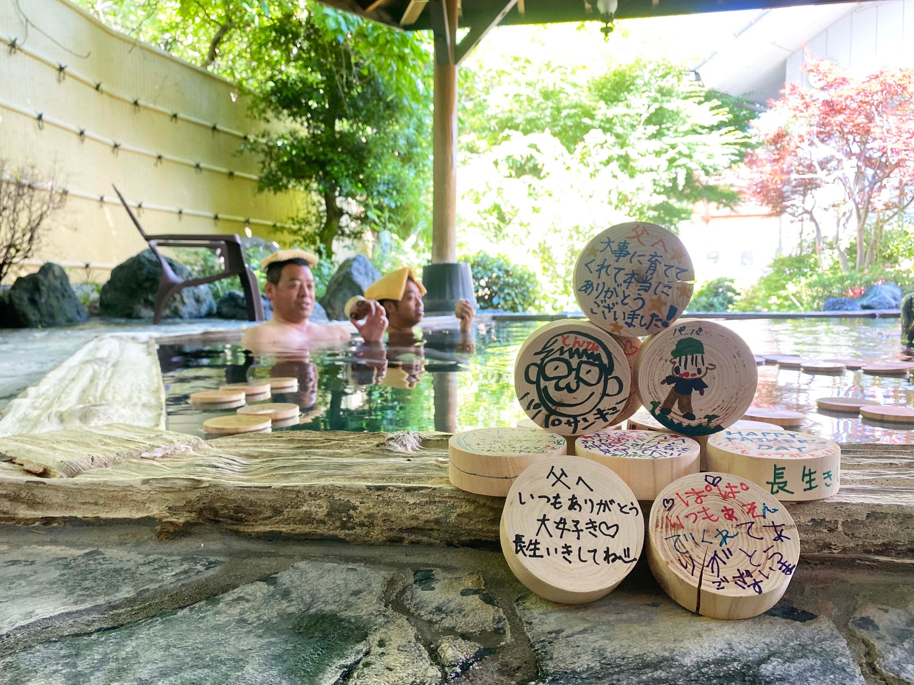 お父さんへの感謝を込めたメッセージがおふろに浮かびます。武甲温泉やおふろcafeで「父の⽇100のありがとう⾵呂」開催
