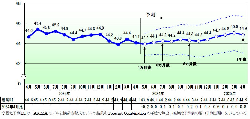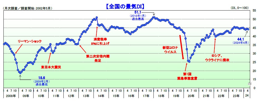 2024年4月の景気DIは前月比0.3ポイント減の44.1となり、2カ月ぶりに悪化した。国内景気は、急速な円安の進行やコスト負担の高まりが収益環境を悪化させたこともあり、2カ月ぶりに後退した。