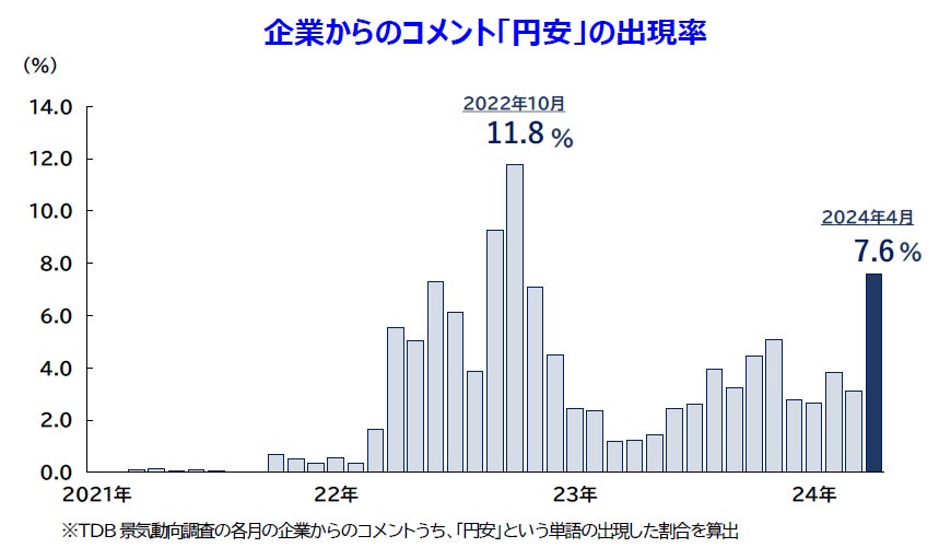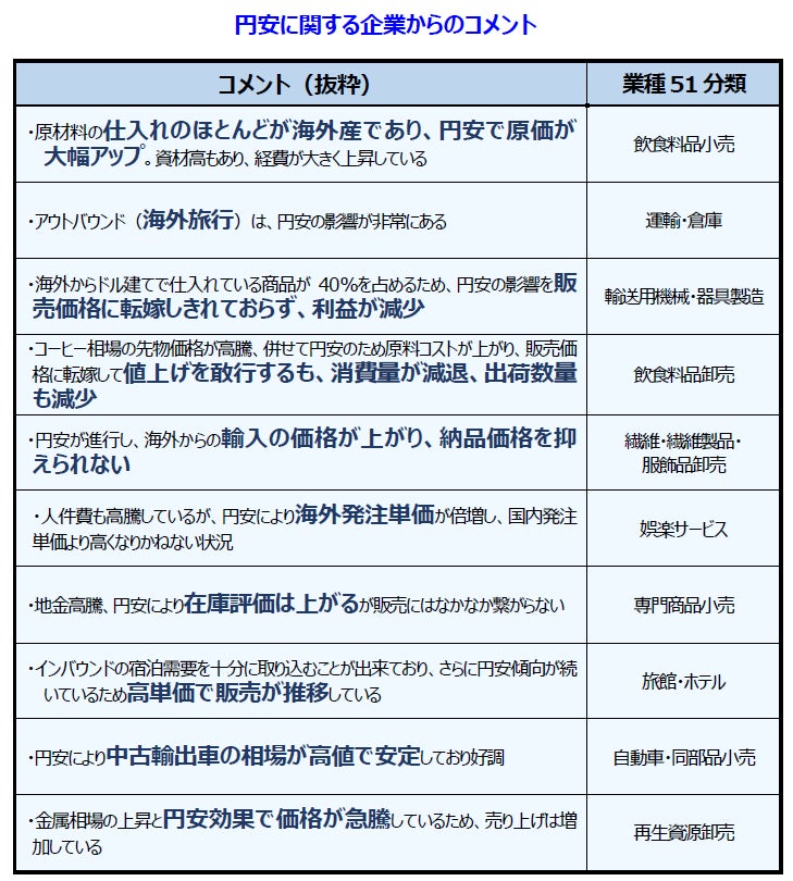 企業からも円安による原材料価格の高騰を危惧する声が多数寄せられた。インバウンド需要など一部で、円安をプラスに捉える企業もある