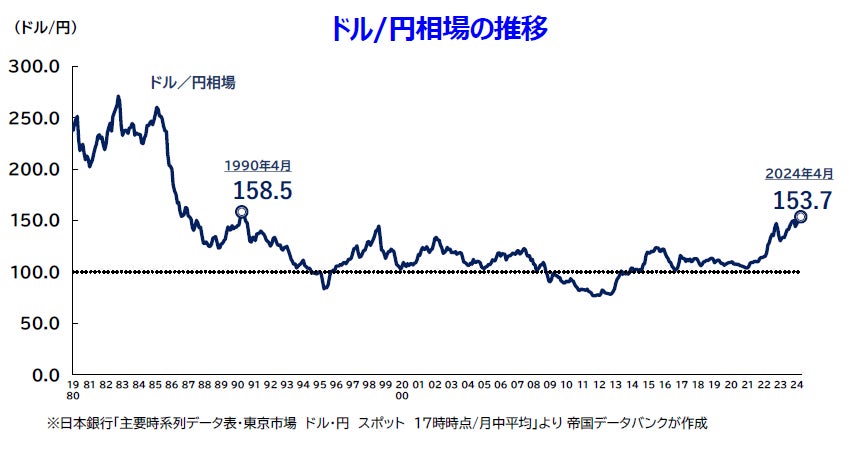 外国為替レートは、2021年以降円安傾向で推移し、2024年4月の月中平均は、1ドル=153.7円となっている。企業からも円安による原材料価格の高騰を危惧する声が多数寄せられた。