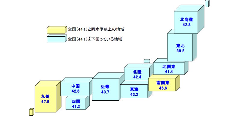 ・『北関東』(41.4)…前月比0.6ポイント減。3カ月ぶりに悪化。「自動車部品メーカーの景況感が停滞したまま」など『製造』が2カ月ぶりに落ち込んだ。また宿泊関連では平日の稼働率が低く、週末に集中する傾向が表れた。規模別では小規模企業ほど大きく下落した。