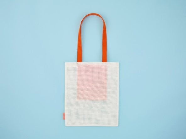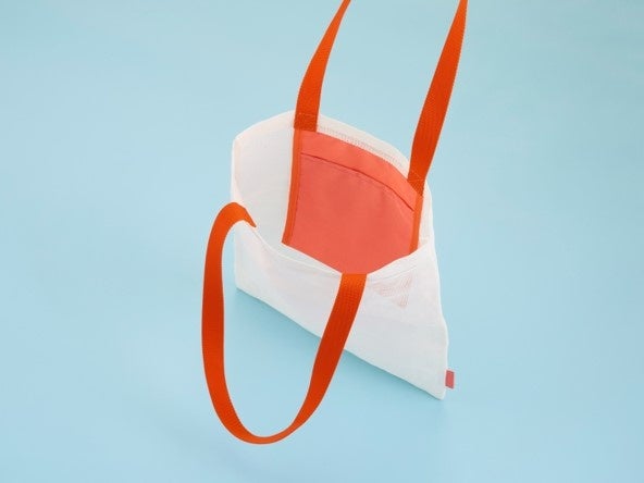 編み目から中身がほどよく透ける本体に、持ち手と内ポケット部にアクセントカラーとなるオレンジ色を採用し、軽快な印象に仕上げました。外側から中身が見えない内ポケットをつけ、持ち手は肩から下げやすい長さにしています。