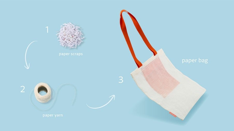 (左から)紙端材、再生紙でできた糸、再生紙の糸を編んでできた布