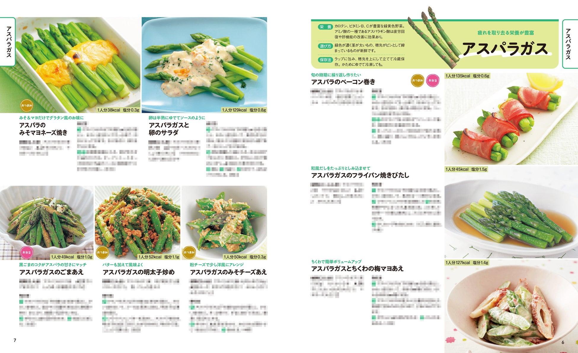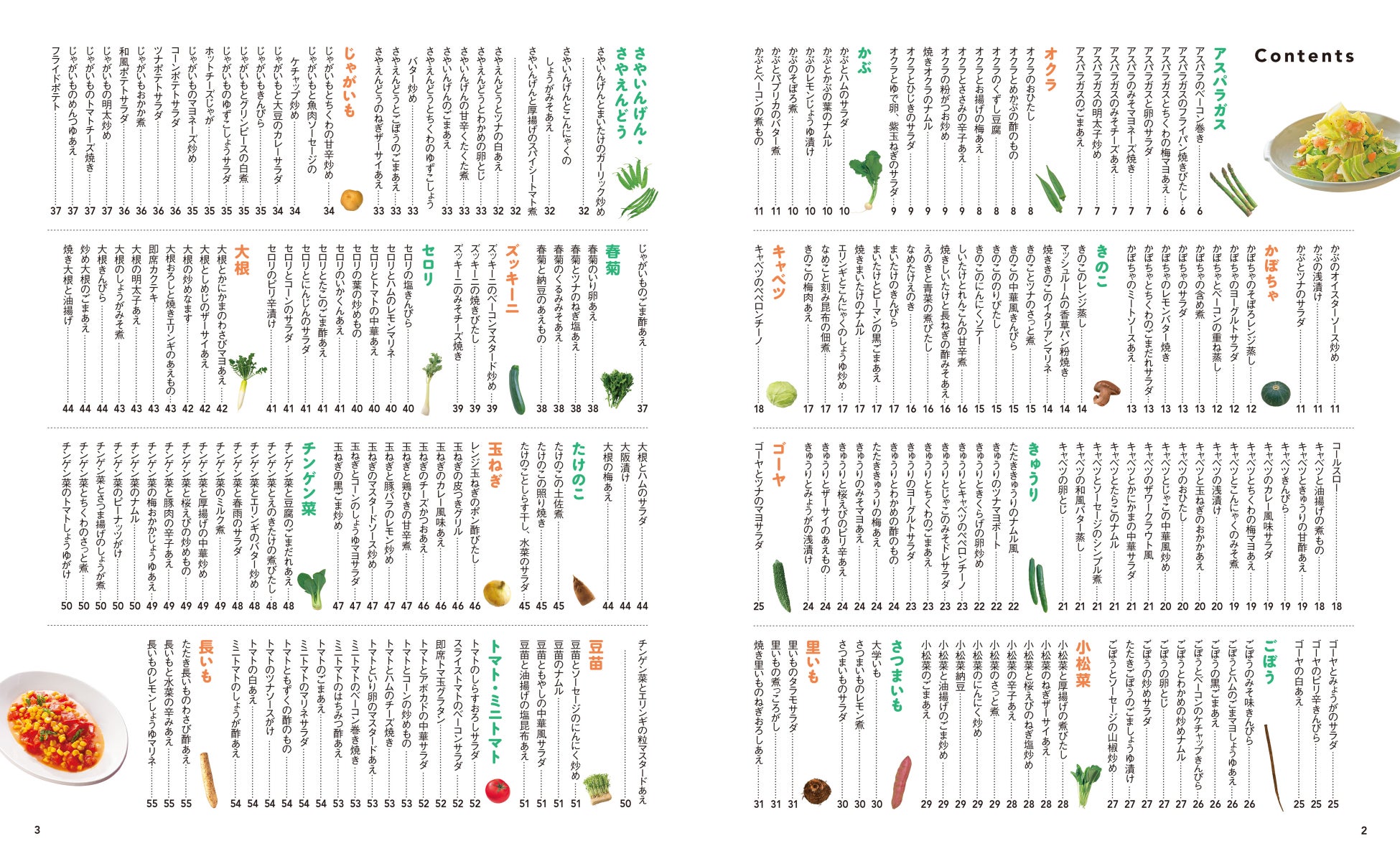 「アスパラガス」のレシピから始まり、「れんこん」のレシピまで、野菜名の50音順でレシピを掲載しているので、食べたい野菜、使いたい野菜の名前でレシピがすぐ探せます。