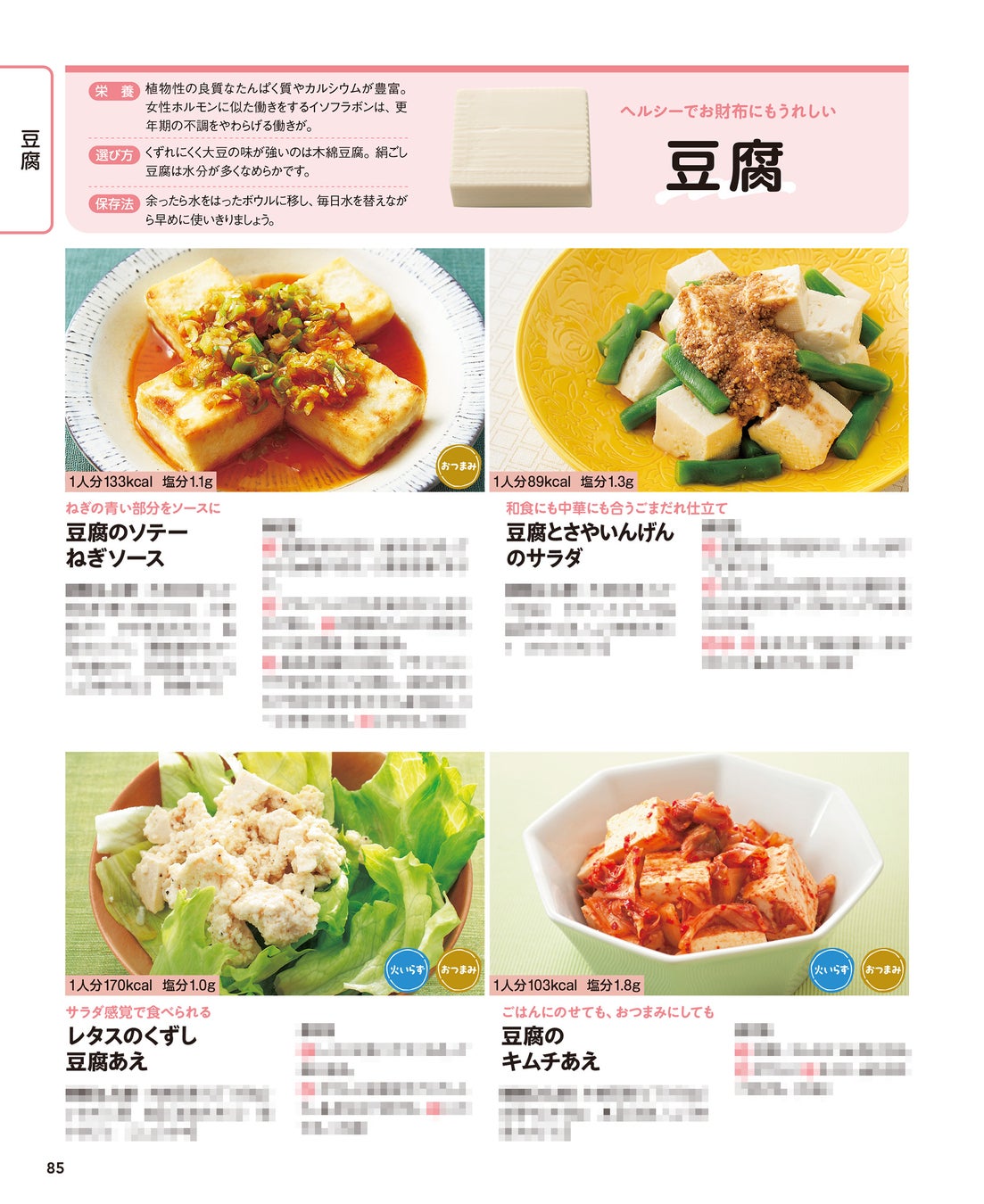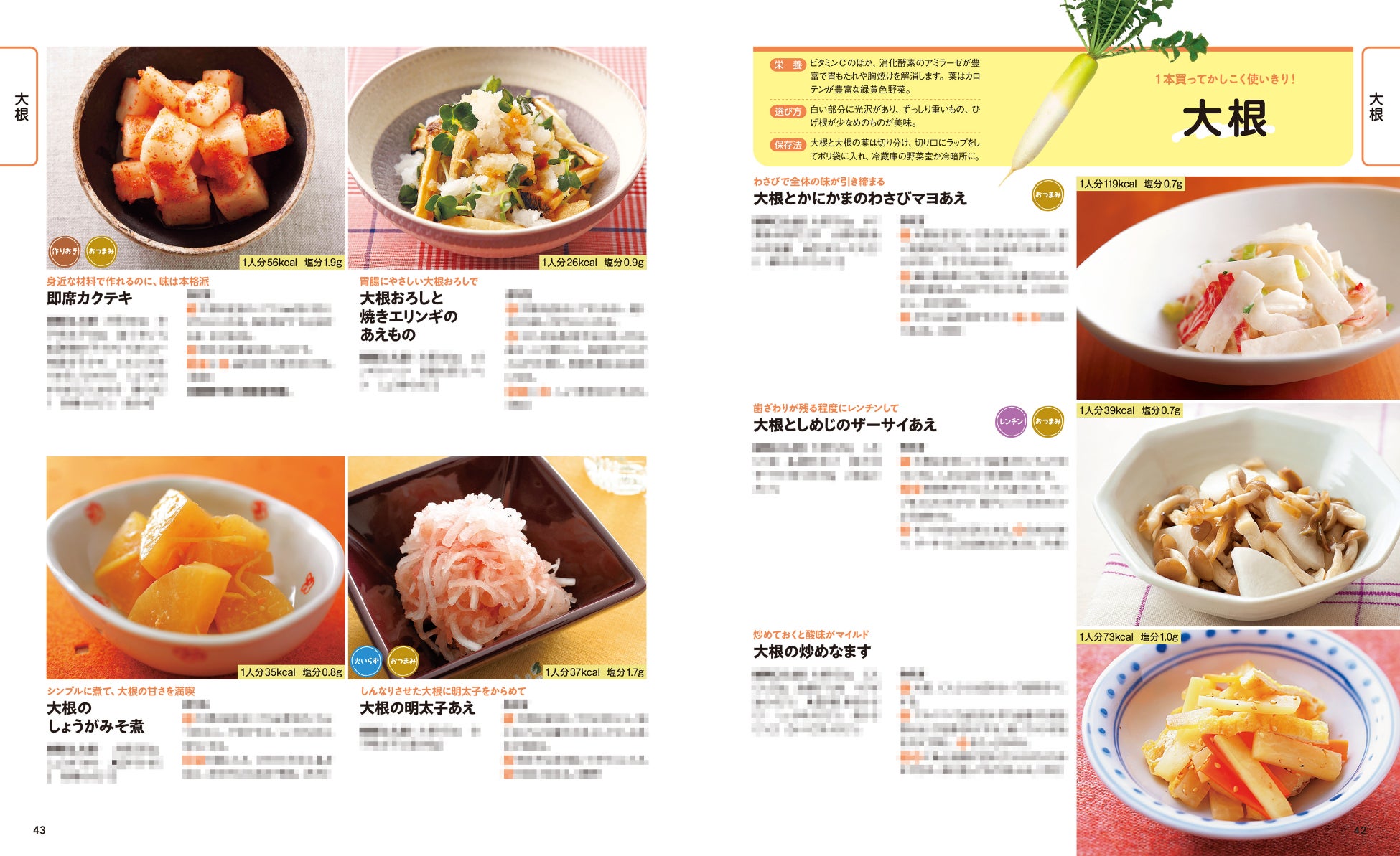 また、全レシピに1人分のカロリー・塩分量を表示しているので、健康のためカロリーが気になる方や、塩分量を気にしている方にも安心です。また、それぞれの項目には、栄養の話、選び方、保存法も表記しています。