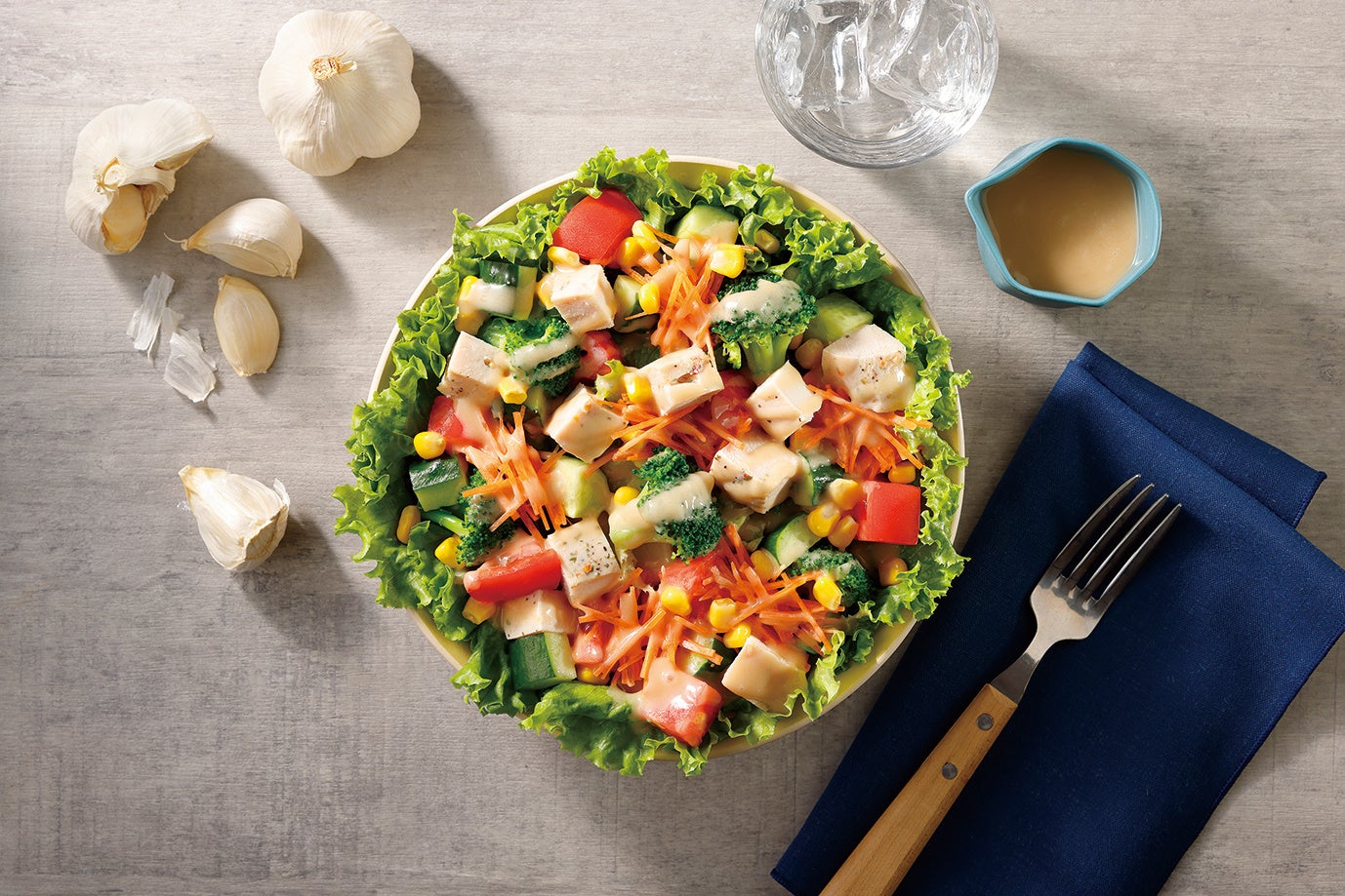 マヨネーズの濃厚なコクと、加熱方法が異なる3種類のにんにくの複雑な風味が調和した味わいです。